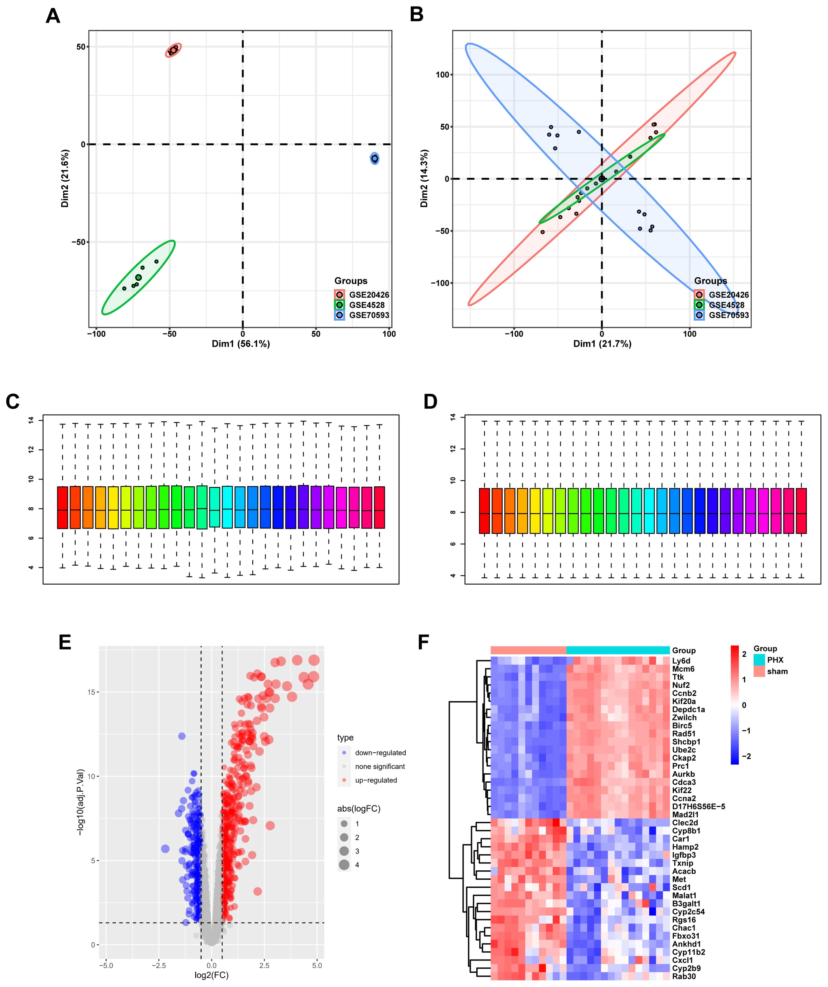 PCA and data normalization were carried out for datasets GSE20426, GSE70593, and GSE4528 (Figures 2A, B). With 26 mouse samples (11 in the control group and 15 in the PHx group), individual dataset analysis showed differences. But after merging, 26 samples and 9,224 genes overlapped, validating data similarity. Box plots before and after normalization demonstrated consistent medians, ensuring data quality for further analysis (Figures 2C, D).
