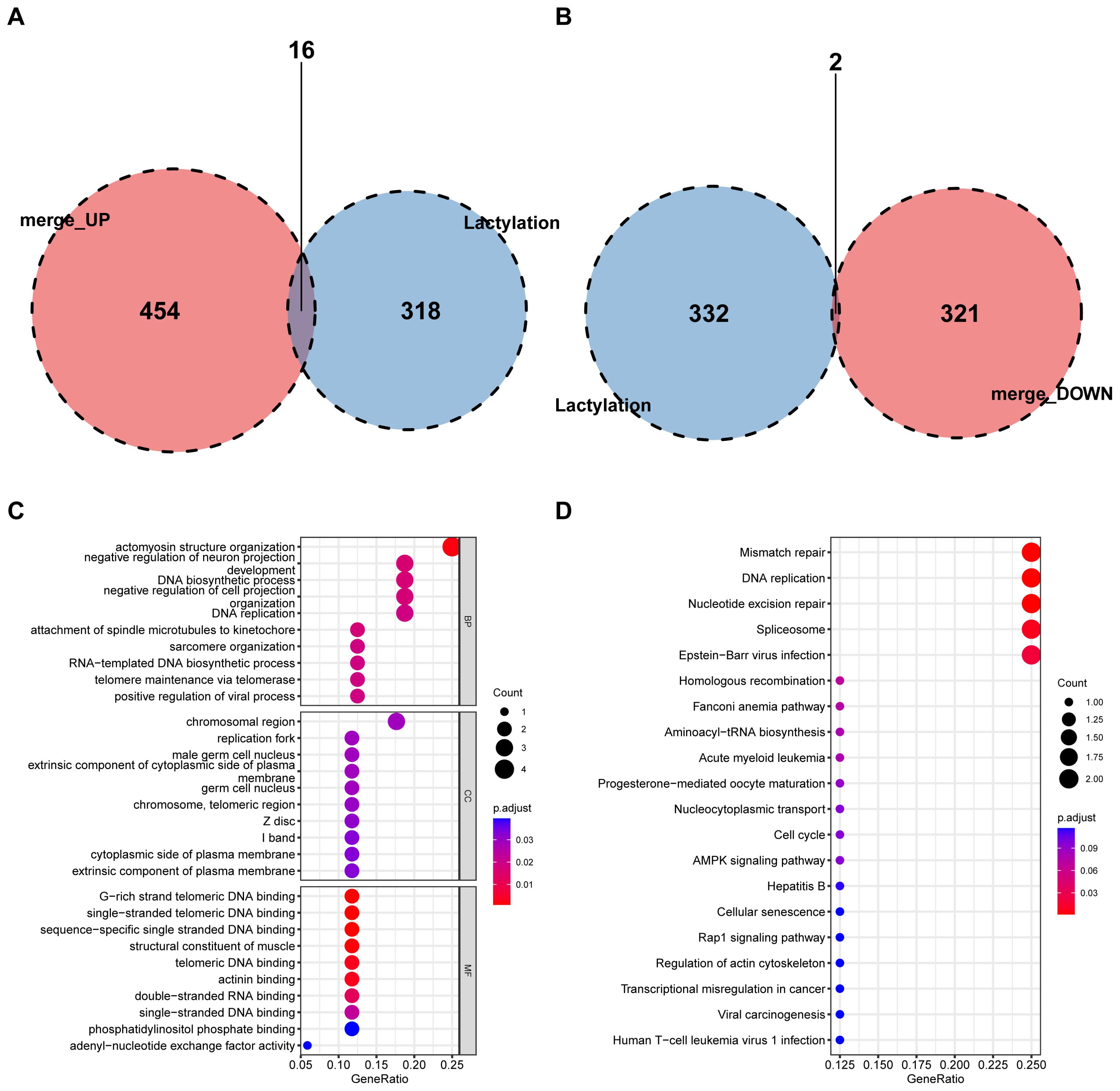 Figure 3. Intersection of DEGs with lactylation modification genes. (A) A Venn diagram shows the intersection of upregulated DEGs with lactylation modification genes, identifying 16 shared genes. (B) Downregulated DEGs intersecting with lactylation genes, revealing 2 shared genes. (C) GO enrichment analysis of shared genes in BP, CC, and MF categories. (D) KEGG pathway analysis highlights key metabolic and signaling pathways affected by intersected genes.
