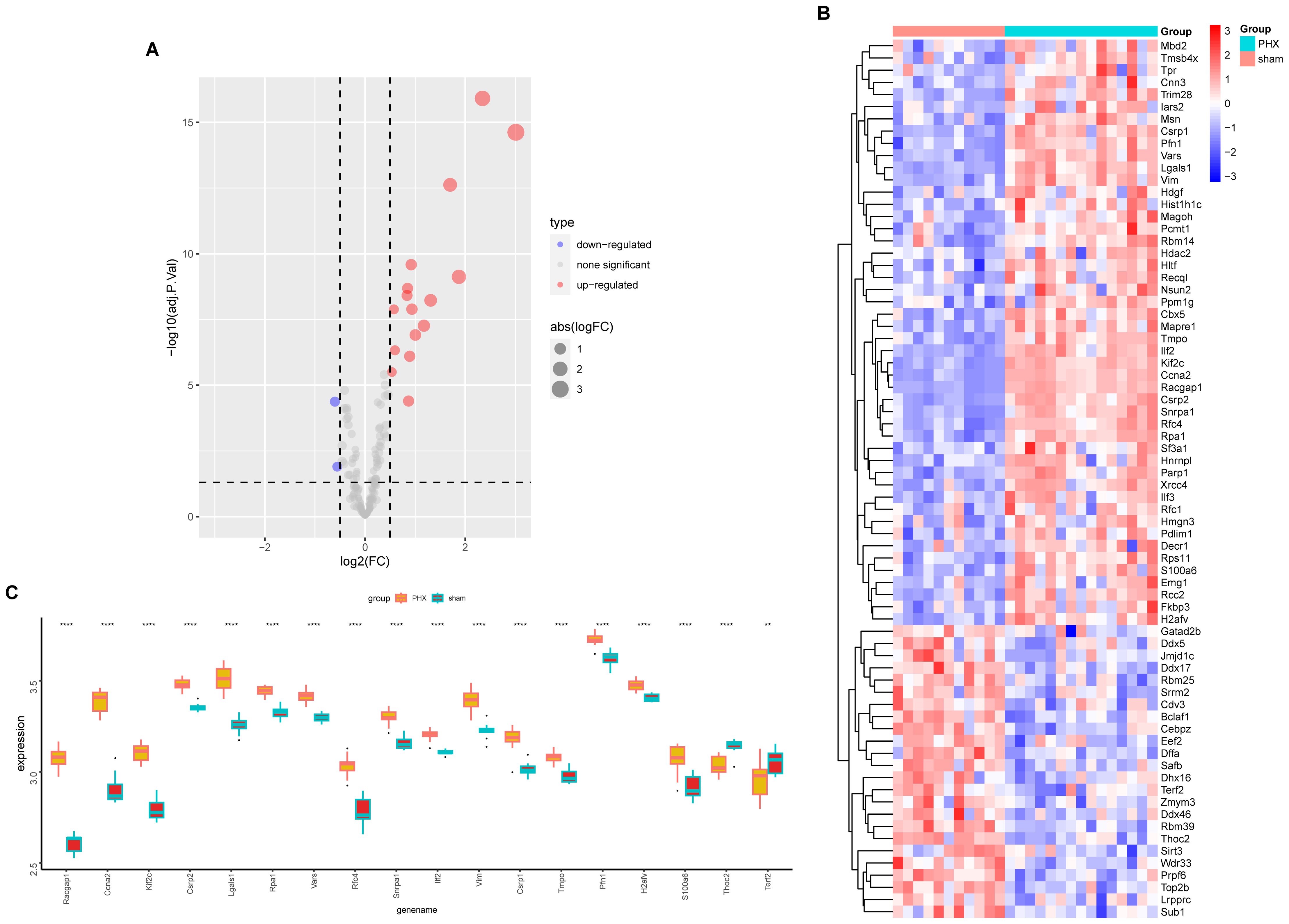 Figure 4. Lactylation modification gene expression analysis. (A) The volcano plot illustrates differential expression of lactylation modification genes between partial hepatectomy and control groups. (B) Heatmap displays expression profiles of lactylation-related genes across samples. (C) Boxplot shows expression differences of 18 intersected genes between groups; statistical significance is marked by asterisks (**p < 0.01, ****p < 0.0001).