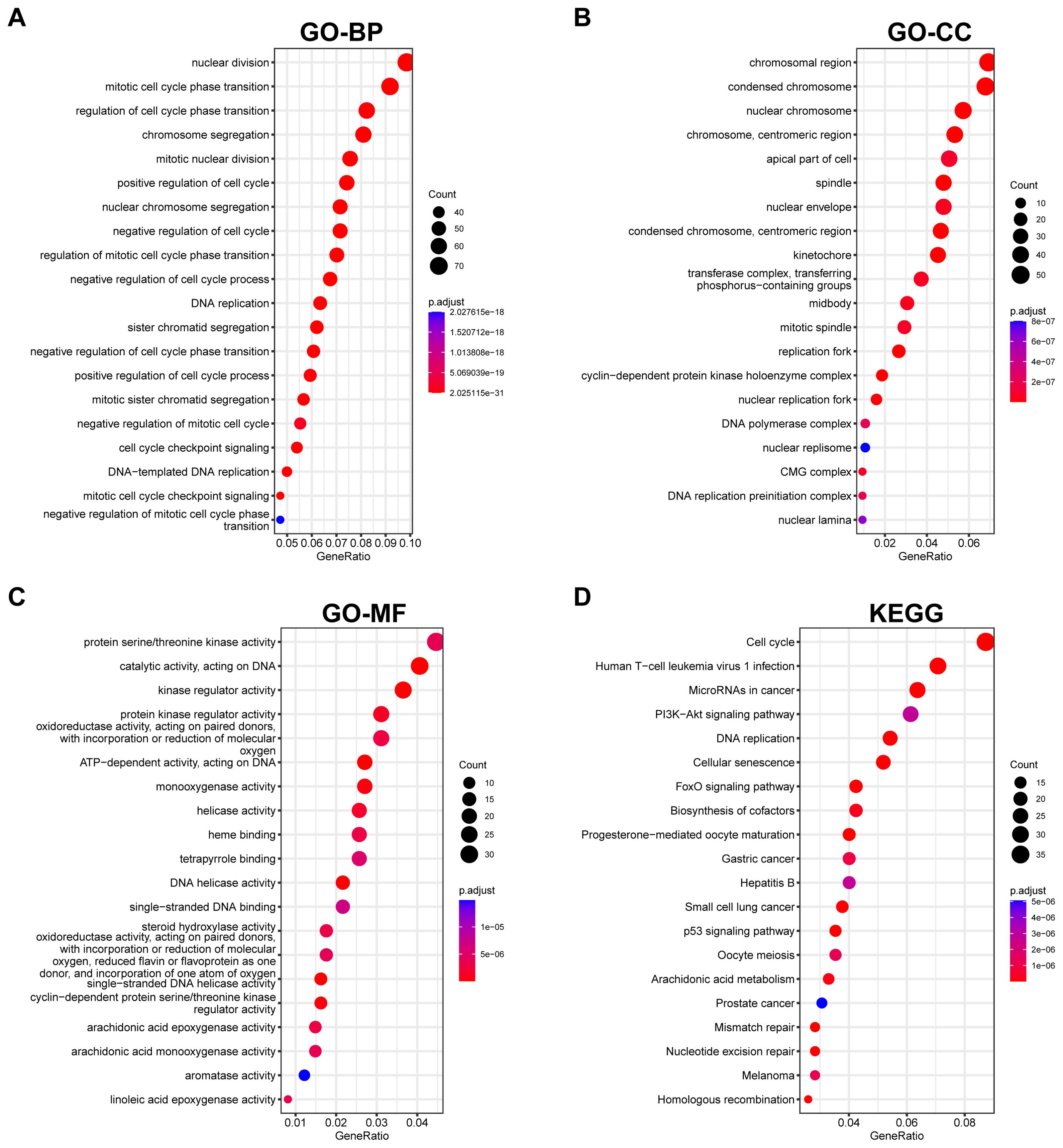 GO and KEGG pathway analyses were conducted on differential and intersecting genes. Differential genes were enriched in nuclear division, mitotic cell cycle, etc. in GO (Figure 5A–C) and Cell cycle and Human T-cell leukemia virus 1 infection in KEGG (Figure 5D). Lactylation modification genes were enriched in actomyosin structure organization in GO and Mismatch repair, DNA replication, etc. in KEGG (Figures 3C, D).