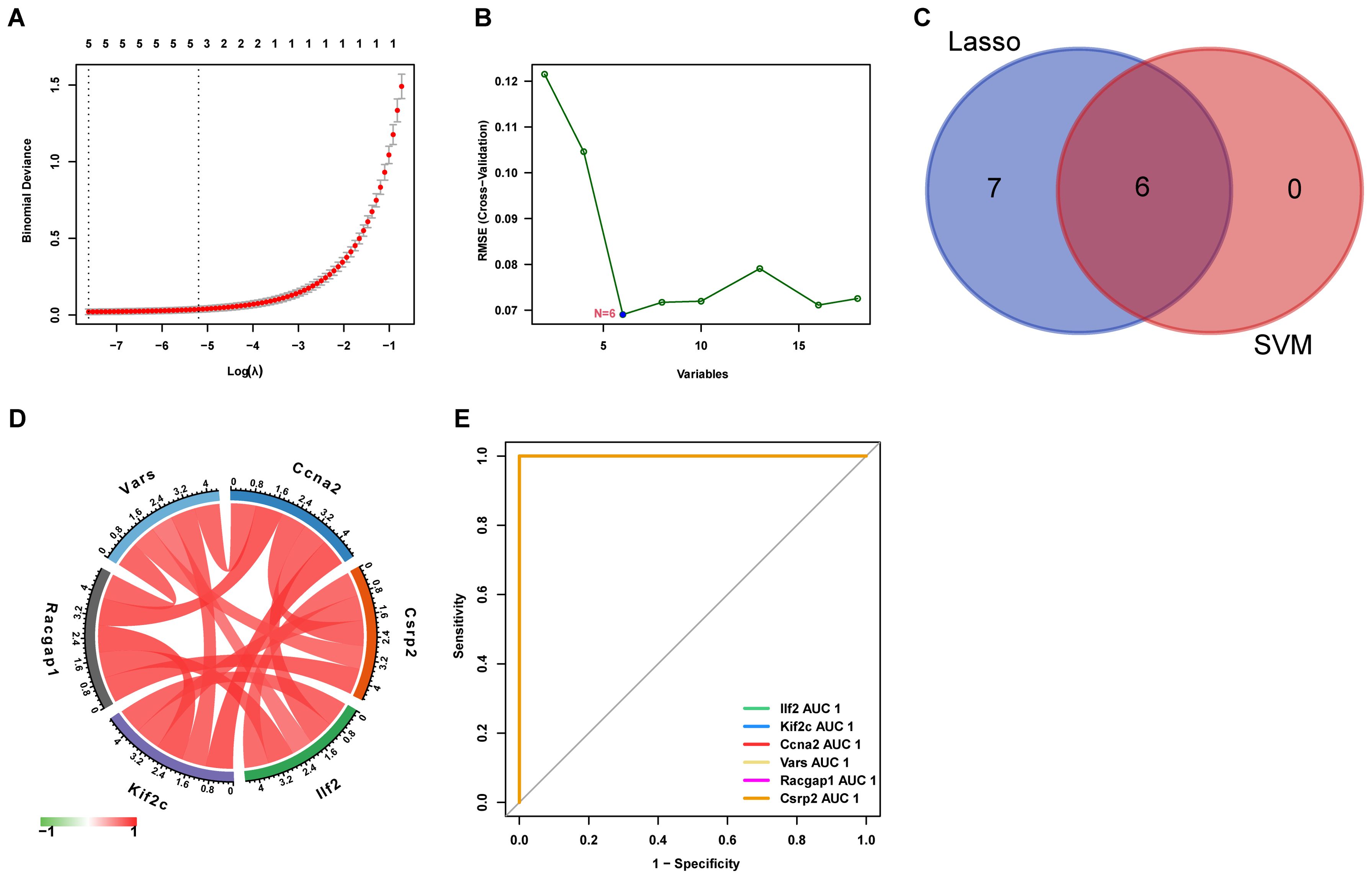 Figure 6. Feature selection for key genes using machine learning (A) LASSO regression selects 13 key genes from lactylation-related DEGs. (B) SVM identifies 6 core genes. (C) The intersection yielded six core genes (D) The correlation matrix shows relationships between these genes, with red indicating positive and green indicating negative correlation. (E) The ROC curve displays the predictive performance of the selected genes.