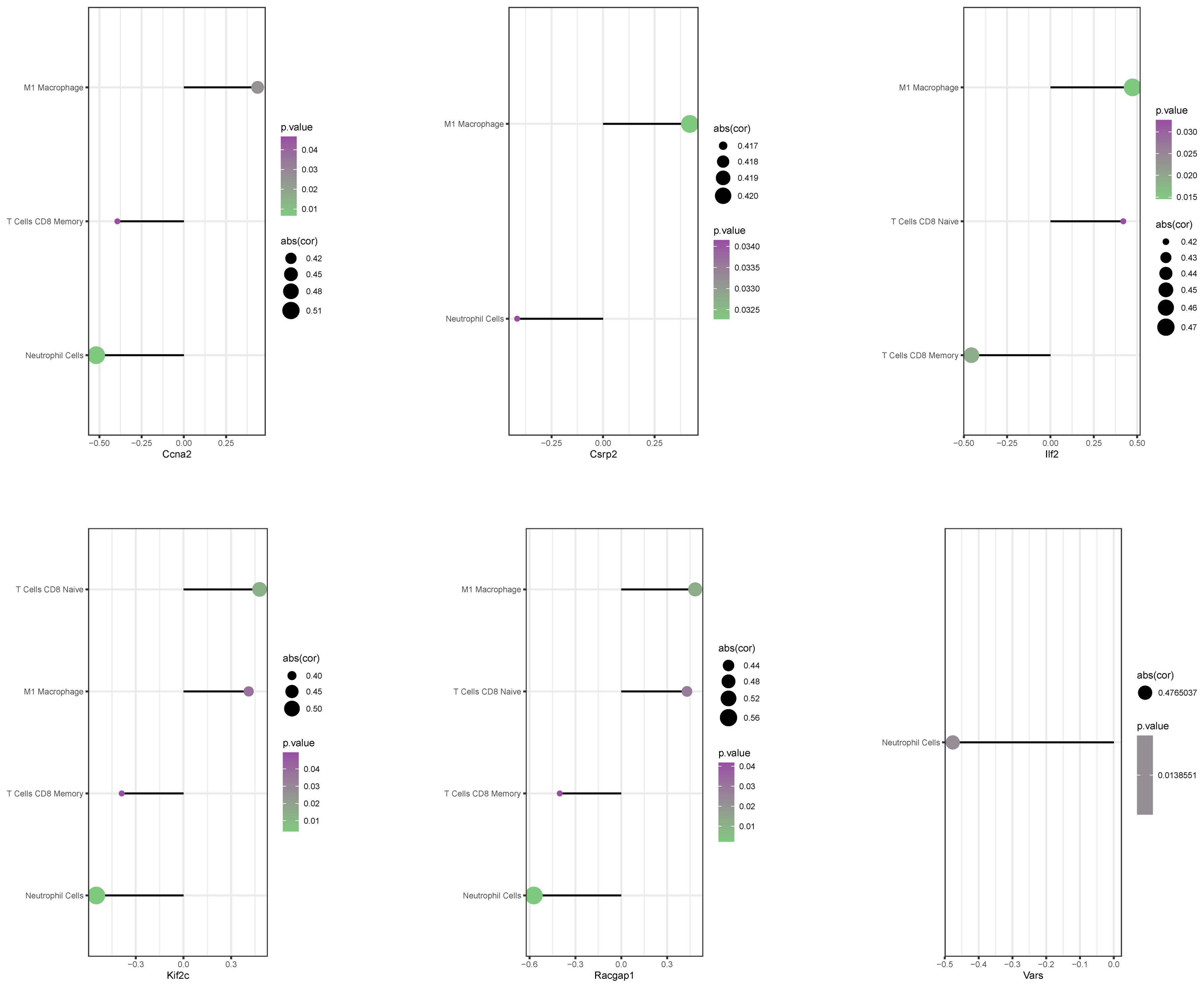 Figure 8. Correlation between core genes and immune cell infiltration. A bubble chart presents the correlation between 6 core genes and immune cell infiltration levels. The size of the circles represents correlation strength, while color intensity indicates p-values.