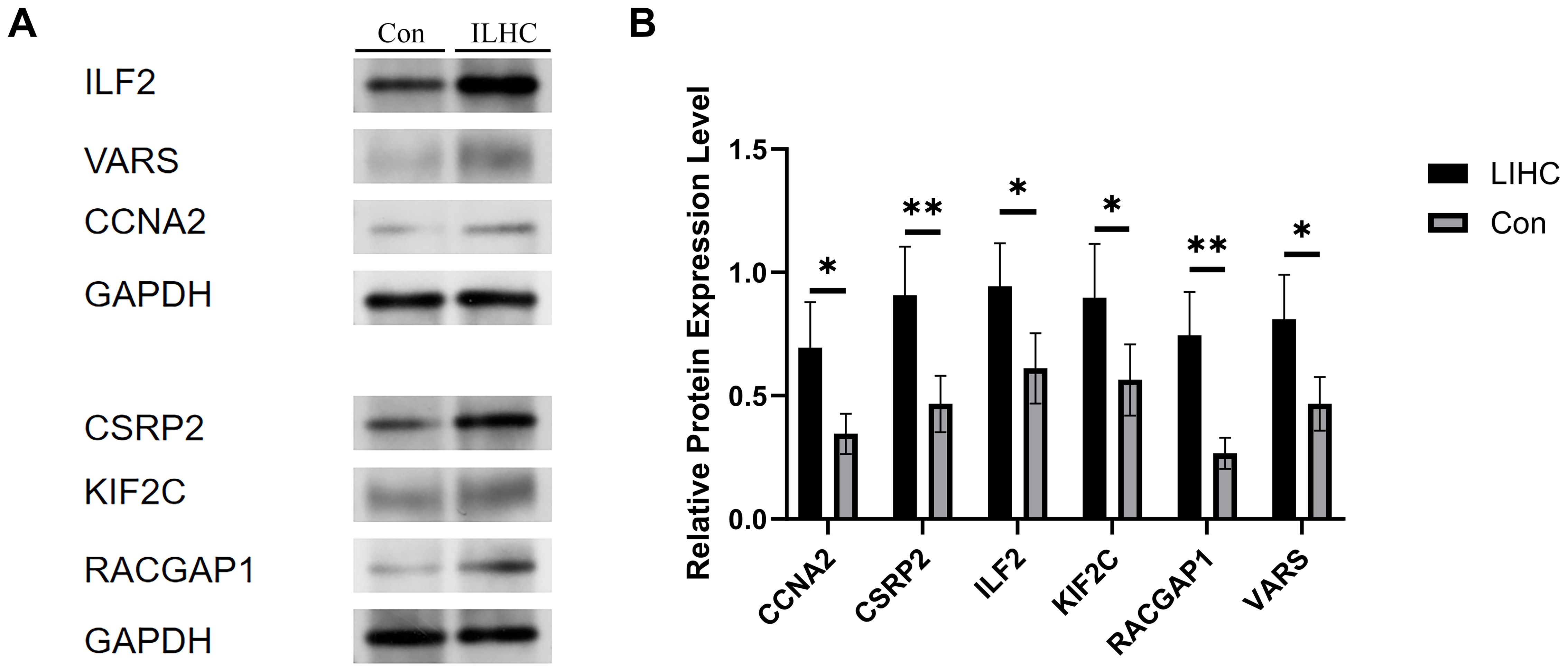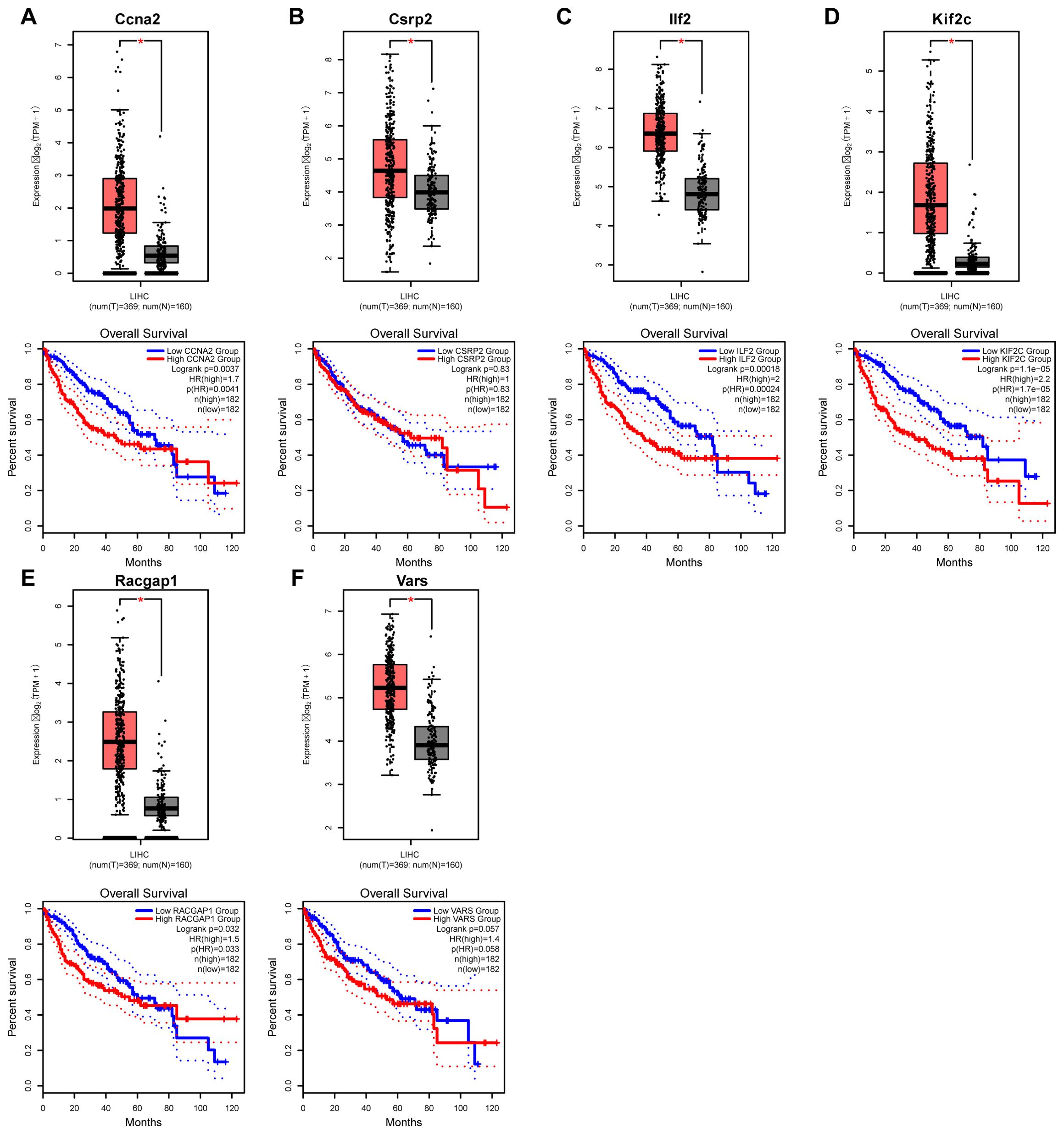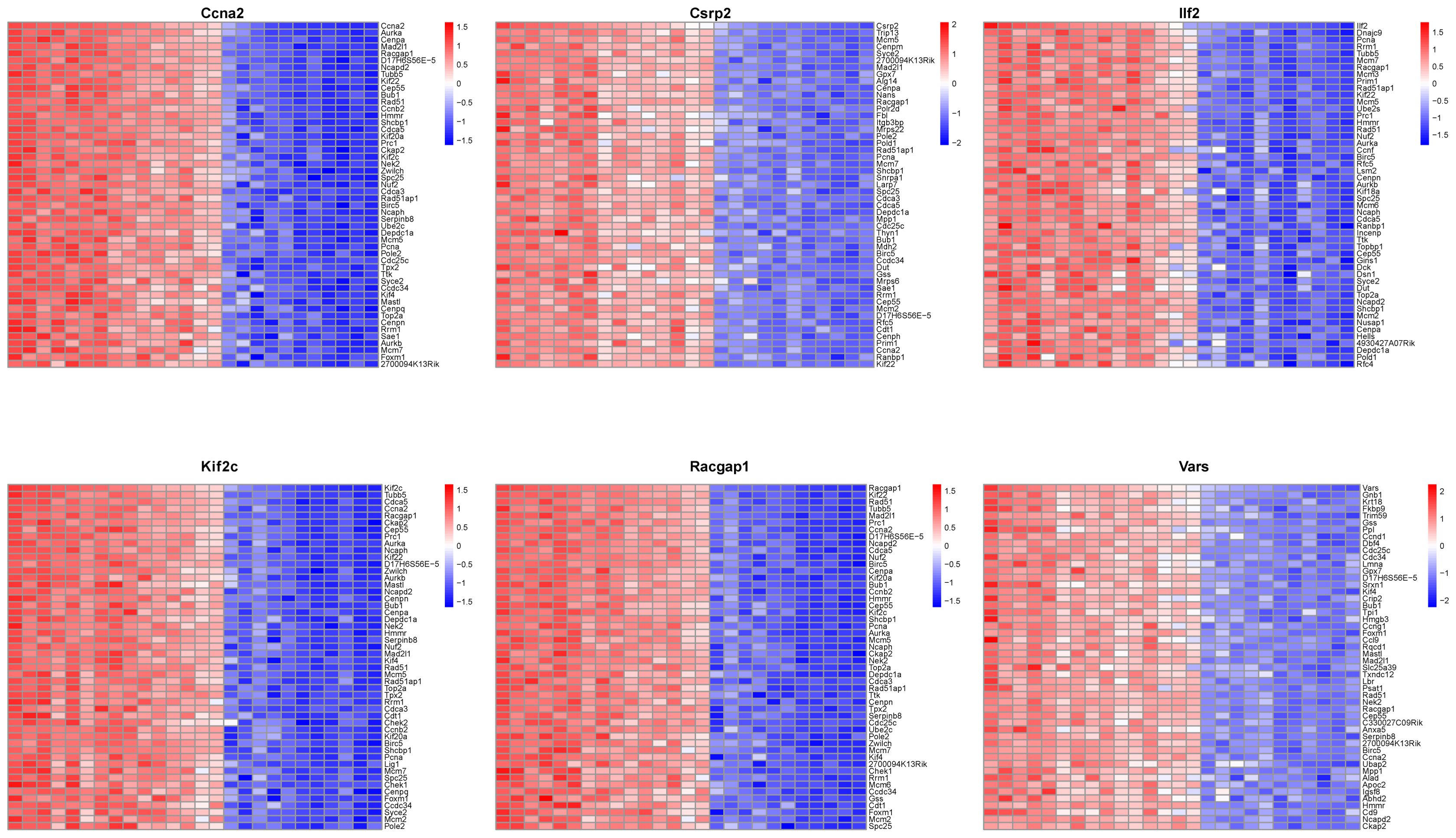 Based on our aforementioned research and relevant literature, we have identified that these genes (Ccna2, Csrp2, Ilf2, Kif2c, Racgap1, Vars) may play pivotal roles in the initiation and progression of HCC. Specifically, Ccna2, Kif2c, and Racgap1 primarily promote tumor cell proliferation and division by regulating the cell cycle and mitotic processes. In contrast, Csrp2, Ilf2, and Vars enhance the invasive potential and survival capabilities of HCC cells through their influence on cell migration, transcriptional regulation, and metabolic activities. Consequently, these genes not only occupy critical positions in the molecular mechanisms underlying HCC but also hold promise as potential molecular biomarkers and therapeutic targets, offering novel research directions and clinical prospects for early diagnosis, targeted therapy, and prognostic evaluation of HCC.