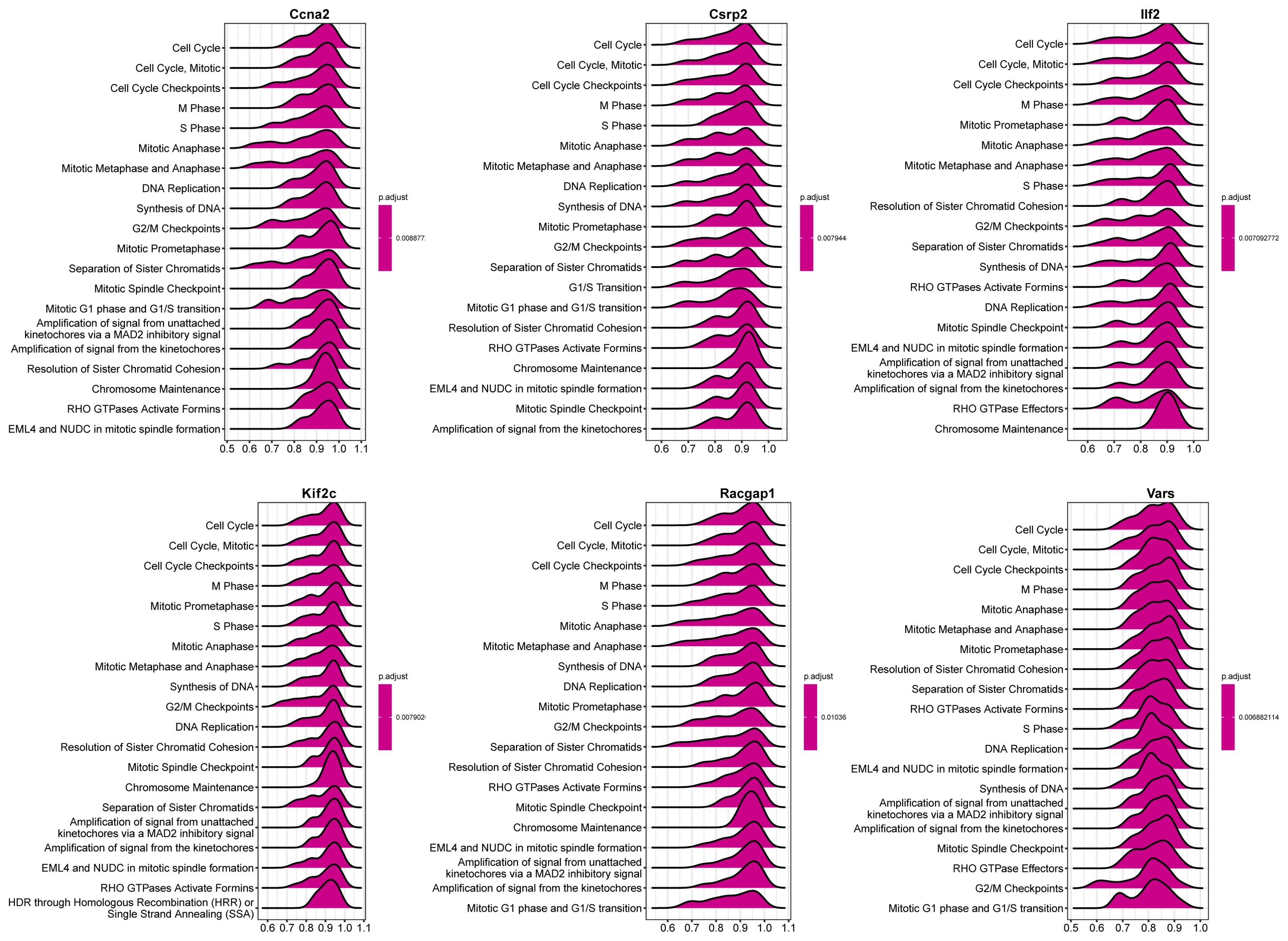 Single gene GSEA of the six core genes indicated their participation in cell - cycle - related pathways (Figure 10). Ccna2 was associated with cell cycle checkpoints, Csrp2 and Ilf2 with the cell cycle and mitosis prophase, etc., suggesting their role in modulating liver regeneration through cell proliferation and division.