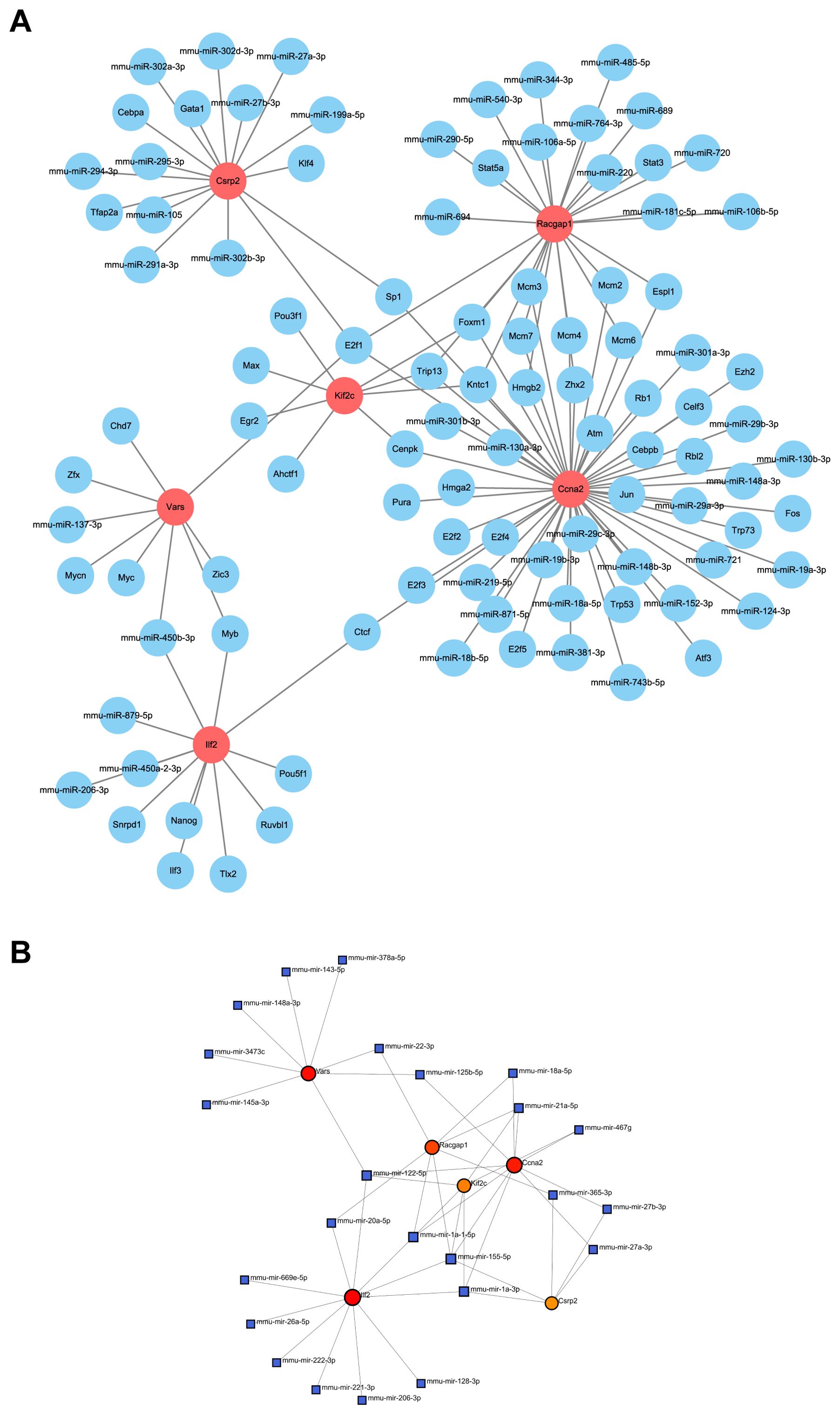 Figure 11. Regulatory network of core genes. (A) Interaction network displays the relationship between core genes and upstream miRNAs and transcription factors. (B) miRNA regulatory network, as identified by NetworkAnalyst, shows key regulatory elements for core genes.