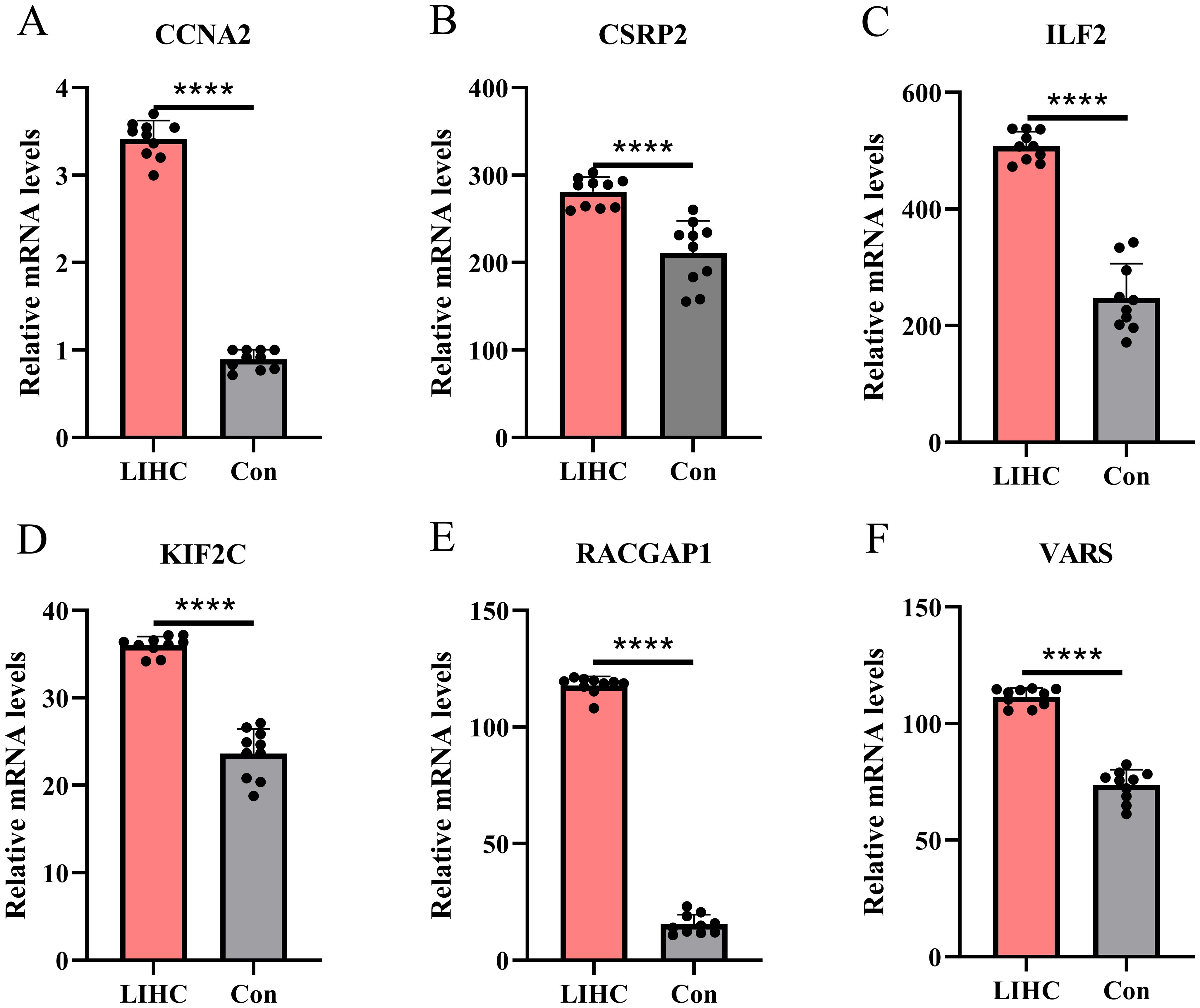 qPCR validation in normal liver and HCC tissues showed that CCNA2, CSRP2, ILF2, KIF2C, RACGAP1, and VARS were significantly upregulated in the HCC group (all p-values < 0.0001) (Figure 13), providing more evidence for their role in liver cancer progression and potential as HCC biomarkers.