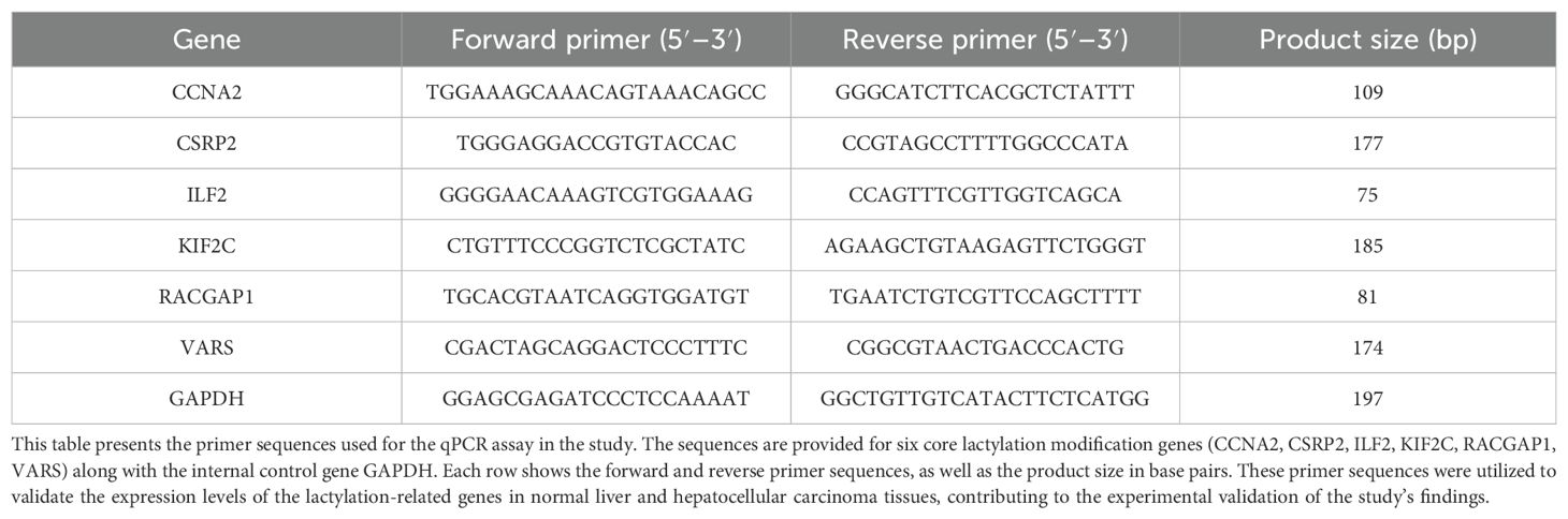 qPCR was performed on 10 normal and 10 hepatocellular carcinoma tissue samples to validate lactylation modification genes. GAPDH was used as an internal control. RNA extraction followed a standard protocol, and cDNA synthesis was done with a commercial kit. qPCR was carried out with specific primers, and relative expression levels were calculated by the 2^(-ΔΔCt) method (Table 1).