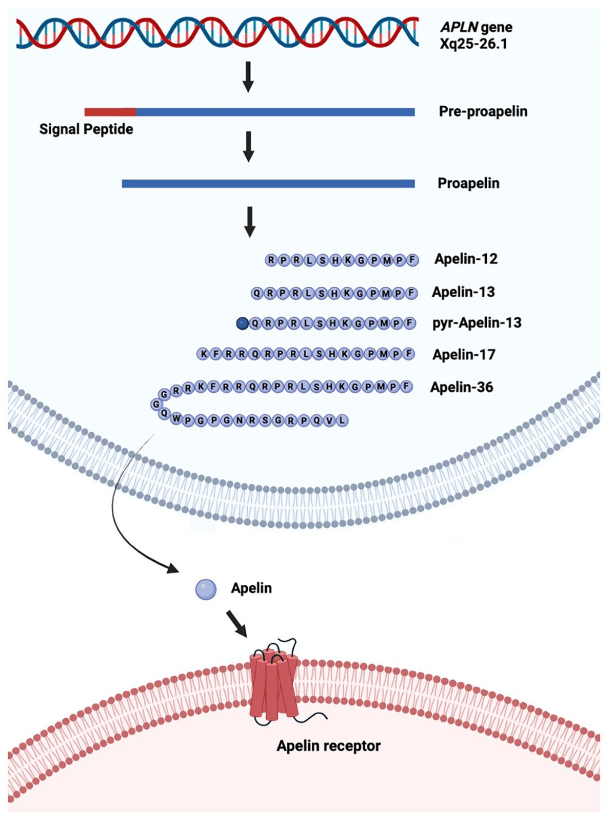Figure 1. Schematic of production of the different isoforms of apelin from the APLN gene. The APLN gene is transcribed into pre-proapelin from which the signal peptide is cleaved to produce proapelin. Proapelin is subsequently modified into one of five different isoforms of apelin (APLN), which leave the cell and bind to the apelin receptor (APLNR). Pyr: pyroglutamated. Created in Biorender.com and based on Melgar-Lesmes et al. (12) and Murali and Aradhyam (13) under CC BY 4.0.