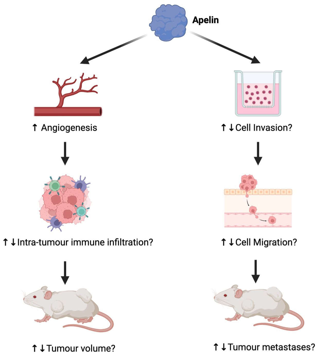 Figure 2. The differential impact of apelin (APLN) on tumors. While APLN increases angiogenesis, in some tumors, the effect has been considered part of functional maturation, causing reduced tumor growth (24), whereas in others, it has contributed to tumor growth (23). As a result, the impact of angiogenesis on intra-tumor immune infiltration and tumor volume varies greatly by tumor. The effect of APLN on cell invasion, migration, and therefore metastases also differs by tumor (6, 7, 25, 26). Figure created in Biorender.com.