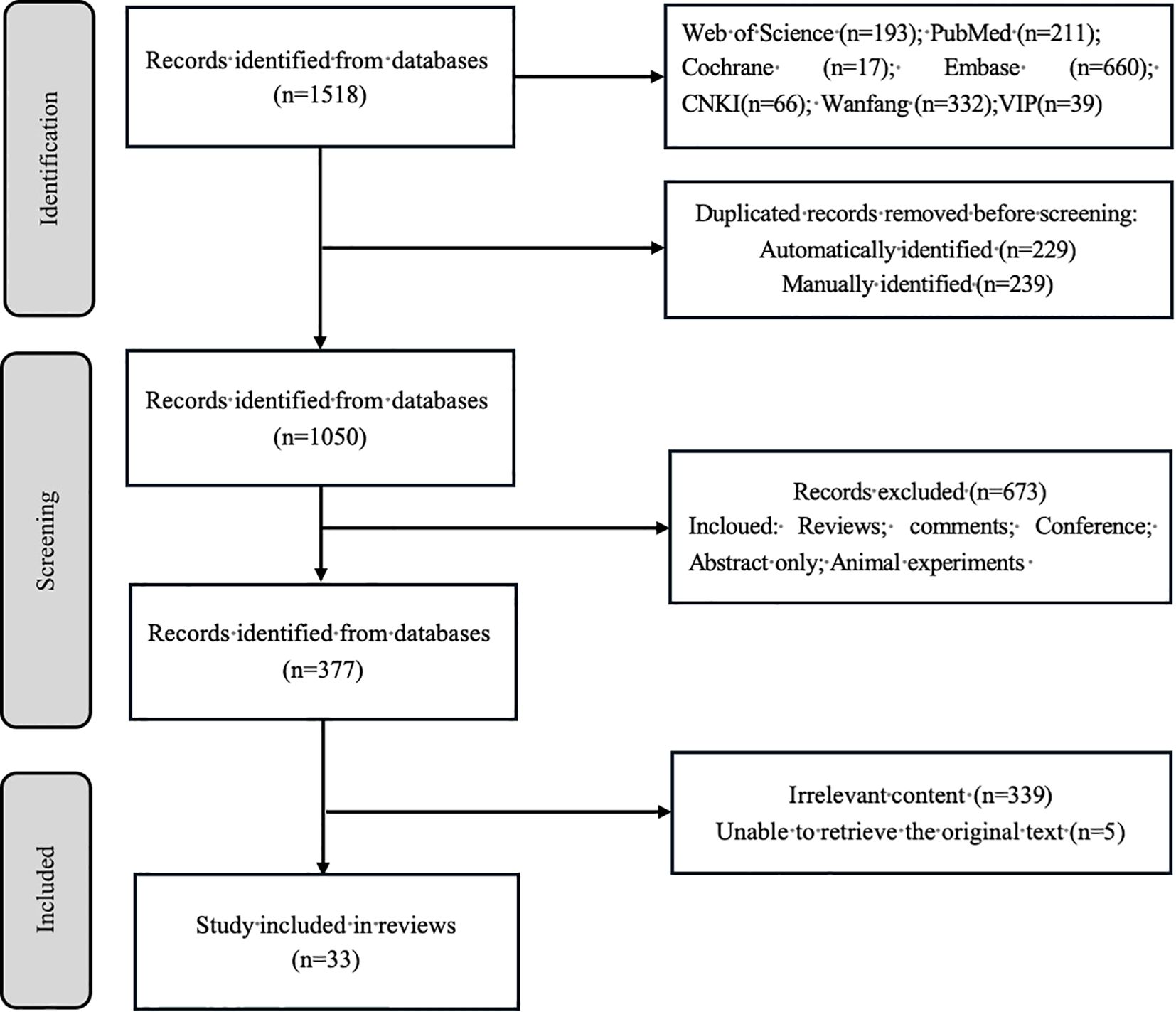 A comprehensive search identified 1,518 publications. Following deduplication (n = 468 excluded), title/abstract screening eliminated 673 records, yielding 377 articles for full-text assessment. Ultimately, 33 studies met the inclusion criteria and were incorporated into this review. The selection process is detailed in Figure 1. Quality appraisal confirmed that all eligible studies were retained for analysis (Appendix 1).