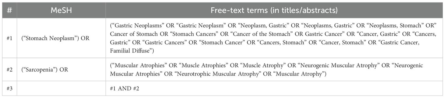 This study conducted a systematic literature search under the guidance of a professional librarian, encompassing records from database inception to 1 July 2025, across PubMed, Web of Science, Embase, Cochrane Library, CNKI, Wanfang, and VIP databases, utilizing the key terms “gastric cancer” and “sarcopenia” as primary search parameters (Table 1).