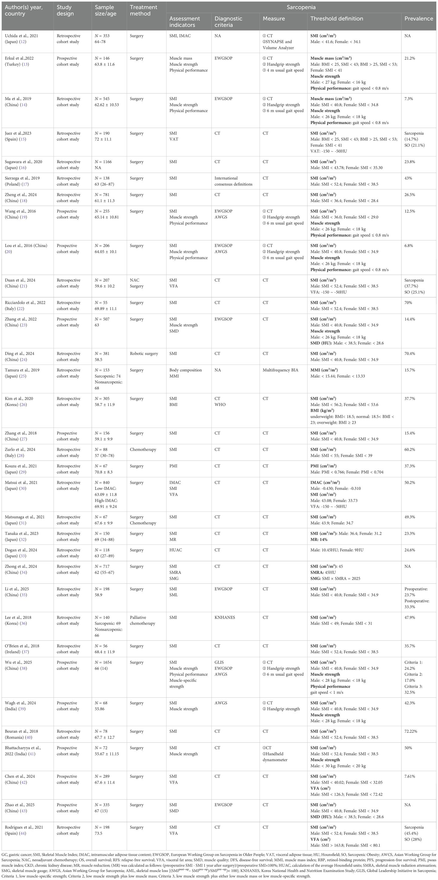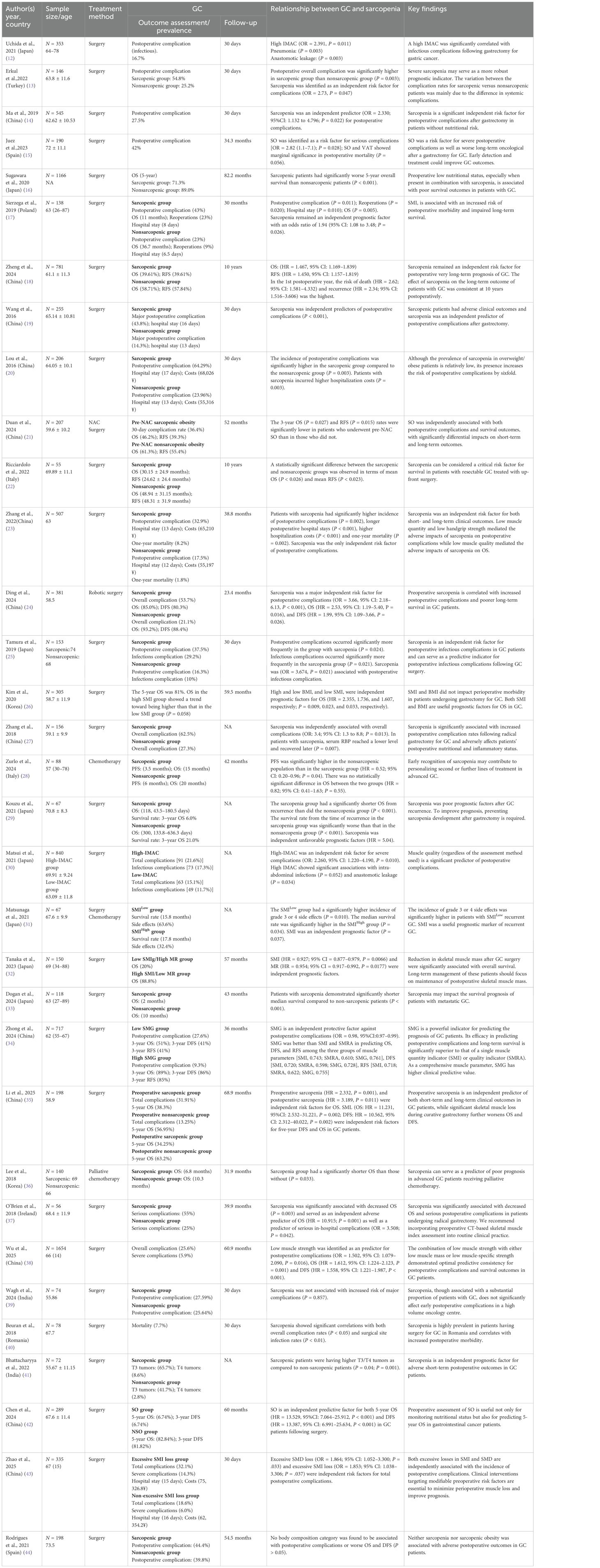 Geographically, 25 studies originated from Asian countries, including 13 from China (14, 18–21, 23, 24, 27, 34, 35, 38, 42, 43), 8 from Japan (12, 16, 25, 29–33), 2 from South Korea (26, 36), and 2 from India (39, 41). European contributions comprised eight studies: Spain (n = 2) (15, 44), Italy (n = 2) (22, 38), with single studies from Turkey (13), Poland (17), Ireland (37), and Romania (40). Publications spanned 2016–2025, encompassing 10,679 participants aged 26–89 years. All studies employed cohort designs, with 23 retrospective cohorts (12, 14–18, 21, 22, 24–26, 28–37, 40, 44) and 10 prospective cohorts (13, 19, 20, 23, 27, 38, 39, 41–43). Regarding therapeutic approaches, surgery was reported as the primary gastric cancer treatment in most studies, while only three investigations incorporated chemotherapy (28, 31, 36)—including one combining surgical and chemotherapeutic approaches (31) (Tables 2, 3).