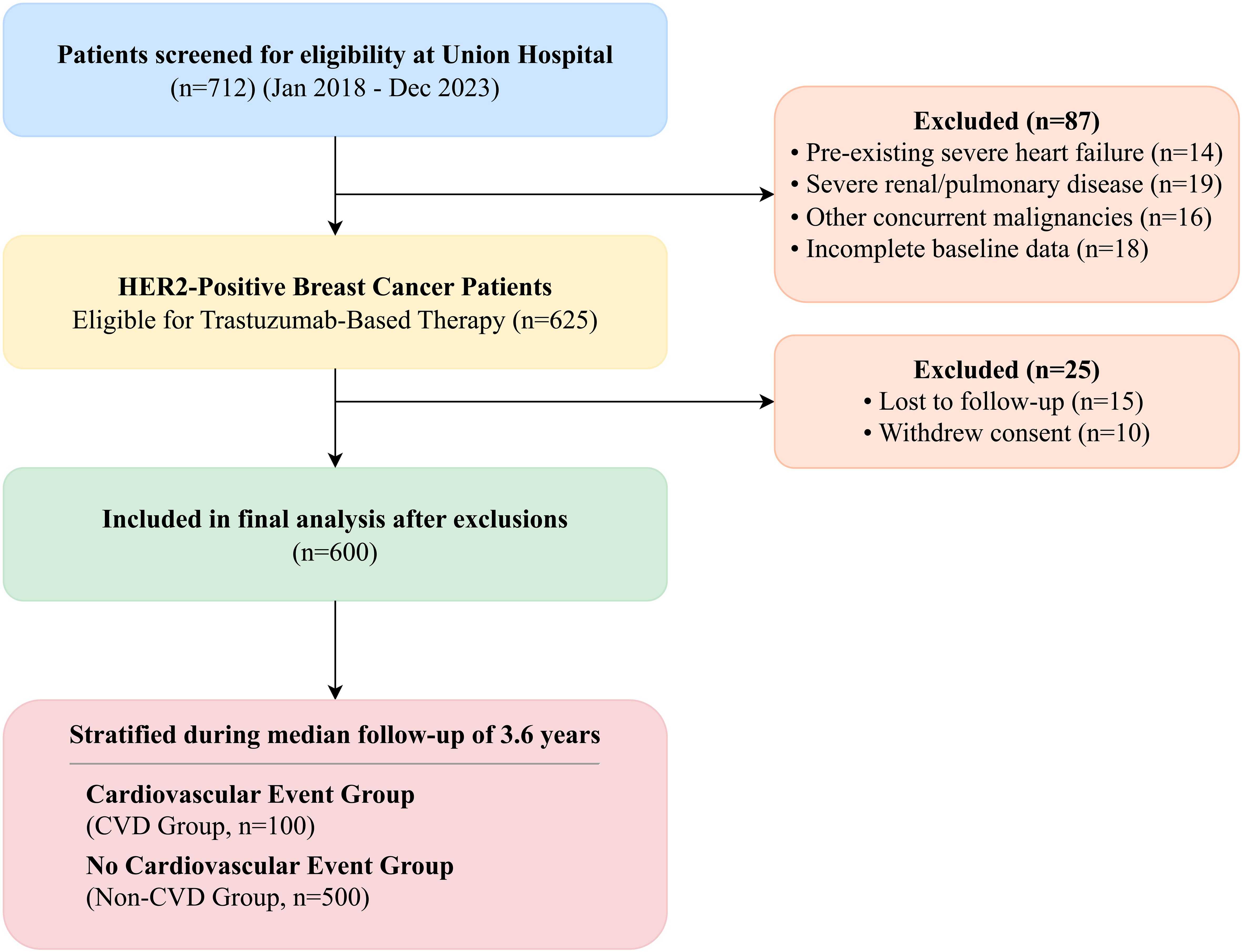 We conducted a retrospective cohort study of patients with HER2-positive breast cancer who initiated trastuzumab-based therapy at Union Hospital, Tongji Medical College, between January 2018 and December 2023. This study was a consecutive enrollment of all eligible patients treated during this period, and the sample size was determined by the available patient population meeting the inclusion criteria, not by a pre-specified power calculation. A total of 712 patients were screened for eligibility from our institutional cancer registry. Patients were excluded if they had pre-existing severe heart failure (New York Heart Association [NYHA] class III-IV), severe renal dysfunction (defined as an estimated glomerular filtration rate [eGFR] < 30 mL/min/1.73m²), severe respiratory diseases such as chronic obstructive pulmonary disease or bronchial asthma, other concurrent malignancies, or incomplete baseline cardiac function data (n=87). This resulted in an initial cohort of 625 patients. A further 25 patients were excluded from the final analysis due to loss to follow-up (n=15) or withdrawal of consent (n=10), leaving a final analytical cohort of 600 patients (Figure 1). Patients were stratified into two groups based on the development of cardiovascular adverse events (CVD group; n=100) or no such events (non-CVD group; n=500) during the follow-up period. This study was approved by the Institutional Review Board of Union Hospital, Tongji Medical College, and the requirement for individual informed consent was waived due to its retrospective nature. The study was conducted in accordance with the Declaration of Helsinki and reported following the STROBE guidelines (21).
