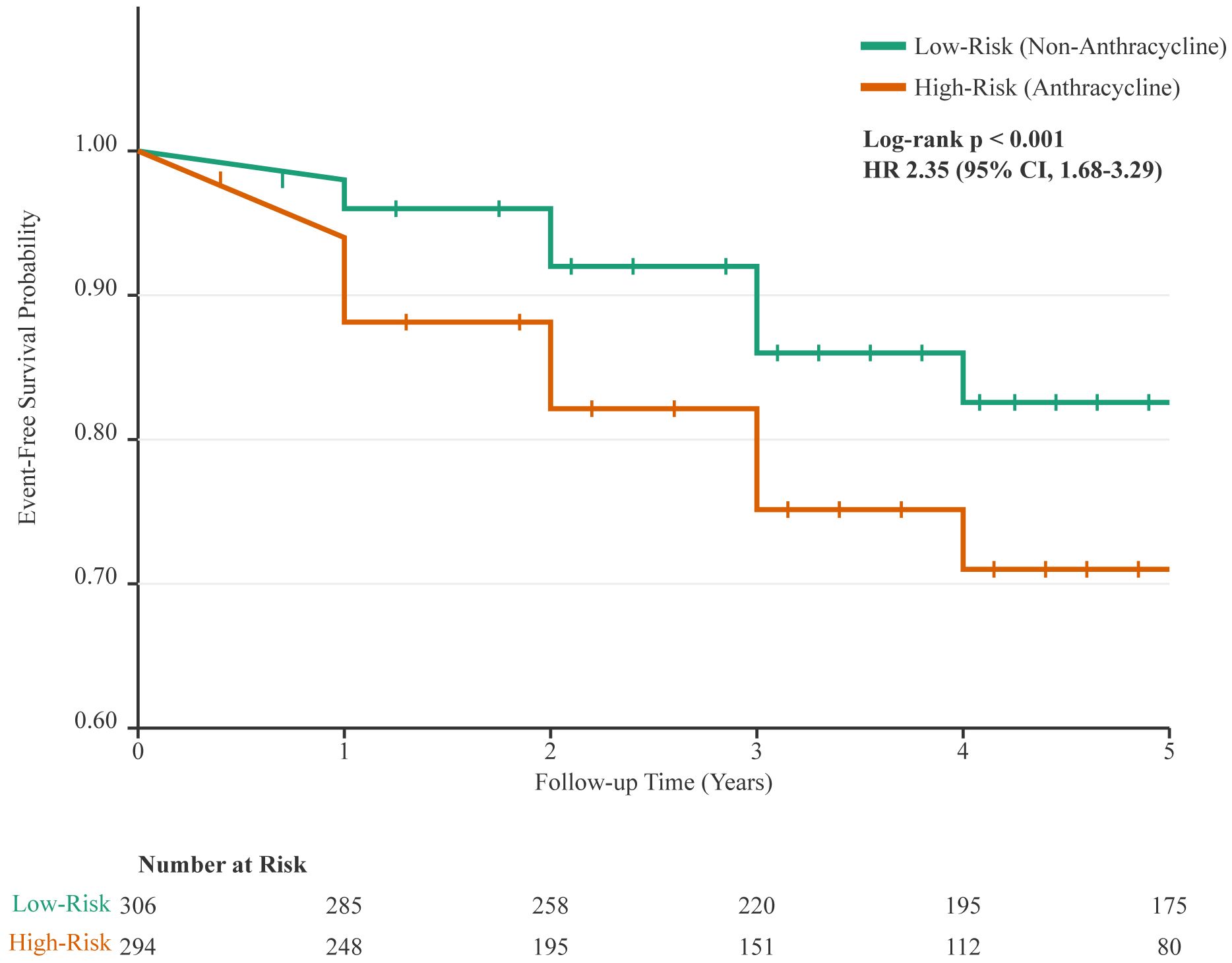 Figure 2. Kaplan-Meier analysis of cardiovascular event-free survival. The curve demonstrates a significantly lower probability of remaining free of cardiovascular events for patients who received anthracycline-based chemotherapy (High-Risk Group, orange line) compared to those who received non-anthracycline regimens (Low-Risk Group, green line). Vertical ticks on the curves indicate censored data points. The difference between the groups was statistically significant (log-rank p < 0.001; Hazard Ratio [HR] for anthracycline-based therapy, 2.35 [95% CI, 1.68-3.29]). The table below the plot indicates the number of patients at risk in each group at yearly intervals.