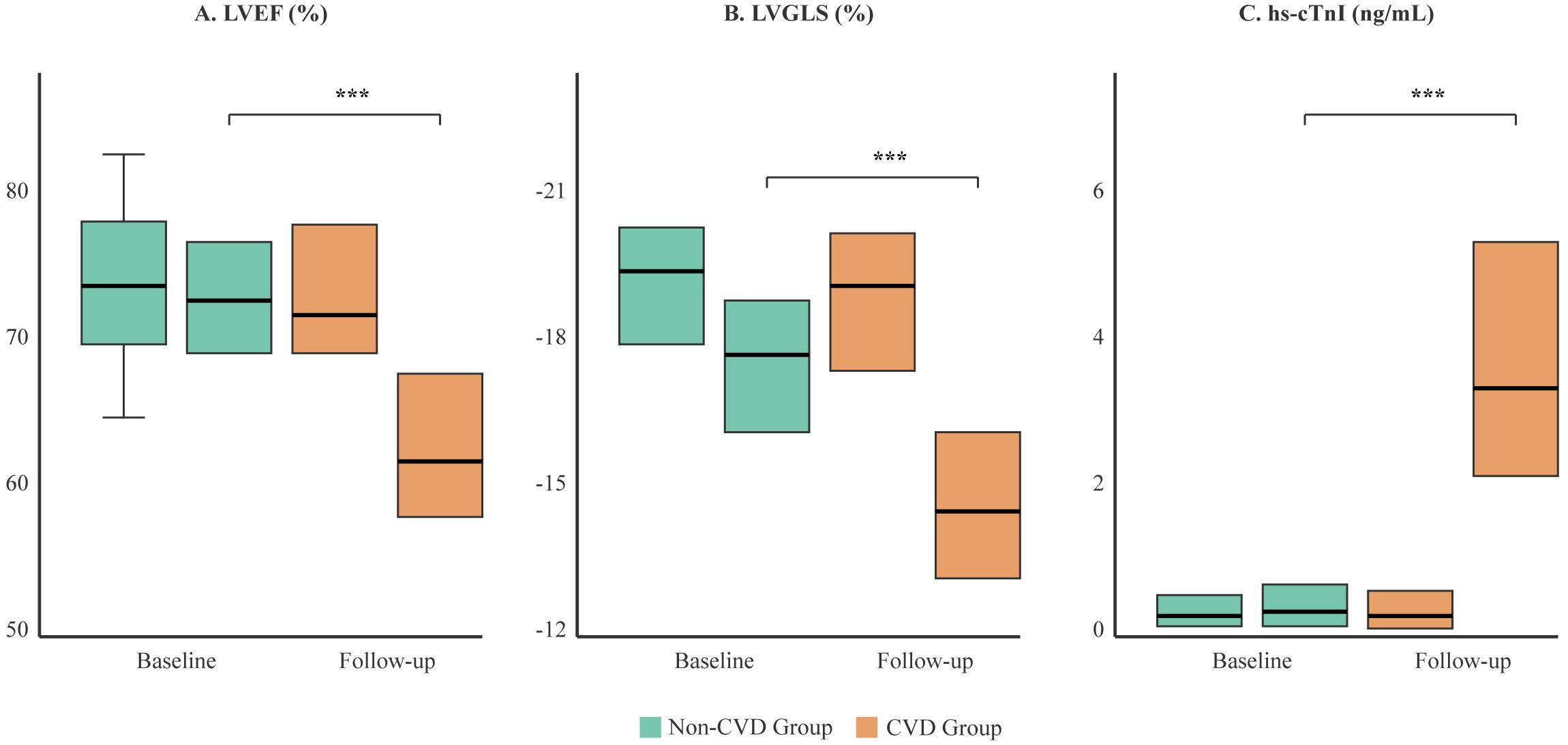 Figure 3. Comparison of cardiac function and biomarker changes between the CVD and non-CVD groups. Box plots illustrate the distribution of (A) Left Ventricular Ejection Fraction (LVEF), (B) Left Ventricular Global Longitudinal Strain (LVGLS), and (C) high-sensitivity Troponin I (hs-cTnI) at baseline and at the final follow-up. The box represents the interquartile range (IQR), the horizontal line indicates the median, and whiskers extend to 1.5 times the IQR. While baseline values were similar, the CVD group (orange) showed a significant deterioration in all parameters at follow-up compared to the non-CVD group (green). ***p < 0.001.