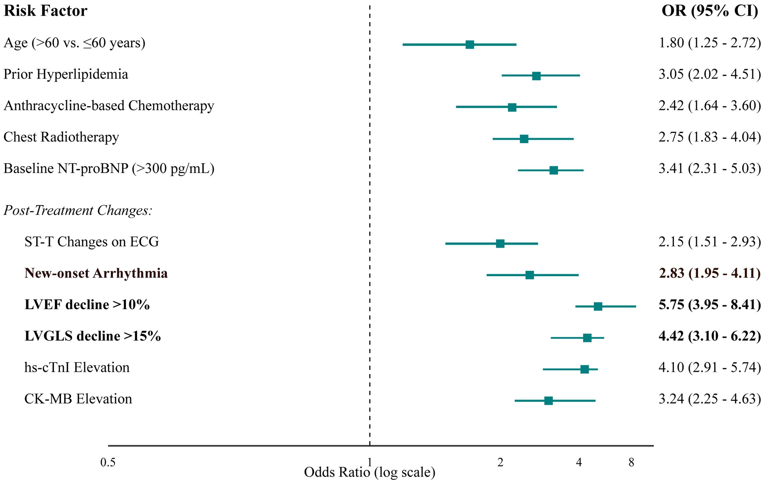 After adjusting for confounders in a multivariate logistic regression model, several factors remained strong, independent predictors (Table 3, Figure 4). Key baseline predictors were prior hyperlipidemia (OR 3.05, 95% CI 2.02-4.51) and use of an anthracycline-based regimen (OR 2.42, 95% CI 1.64-3.60). However, the most powerful predictors were on-treatment changes in cardiac monitoring parameters. A decline in LVEF of >10% (OR 5.75, 95% CI 3.95-8.41) and a relative decline in LVGLS of >15% (OR 4.42, 95% CI 3.10-6.22) were the strongest predictors of subsequent clinical events. Elevated cardiac biomarkers, particularly hs-cTnI, were also highly predictive (OR 4.10, 95% CI 2.91-5.74).