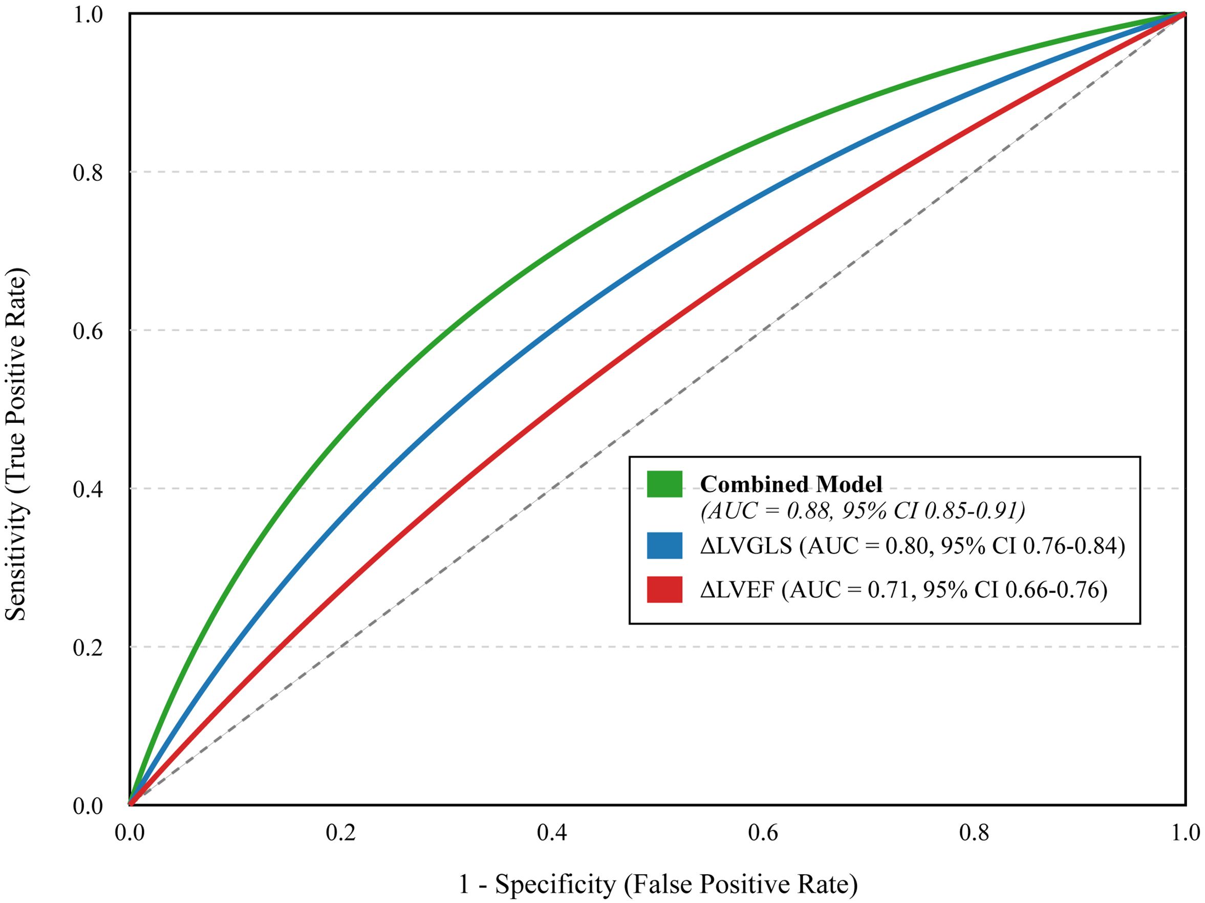 Figure 5. Receiver Operating Characteristic (ROC) curves for different predictive models. The curves illustrate the diagnostic ability of a model based on post-treatment change in LVEF alone (ΔLVEF, red line), a model based on post-treatment change in LVGLS alone (ΔLVGLS, blue line), and a comprehensive combined model including baseline risk factors and on-treatment changes in both imaging and biomarkers (Combined Model, green line). The area under the curve (AUC) with 95% confidence intervals is provided for each model. The diagonal dashed line represents a test with no discriminatory power (AUC = 0.5). The “Combined Model” incorporates significant baseline risk factors (age >60, hyperlipidemia, anthracycline/radiotherapy use, NT-proBNP >300 pg/mL) and on-treatment changes (LVEF decline >10%, LVGLS decline >15%, new-onset arrhythmia, hs-cTnI elevation).