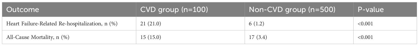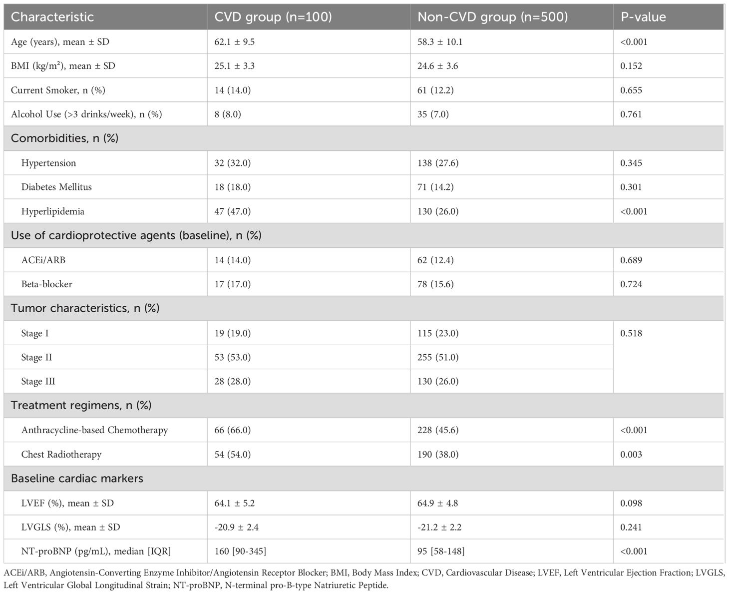 A total of 600 patients were included in the final analysis. The median age of the cohort was 59 years (IQR, 50-66), and the median follow-up duration was 3.6 years (IQR, 2.2-5.1). During this period, 100 patients (16.7%) developed cardiovascular adverse events. The breakdown of events in the CVD group (n=100) was as follows: 11 patients (11.0%) developed symptomatic heart failure (NYHA Class II-IV), 51 (51.0%) had an asymptomatic decline in LVEF meeting CTRCD criteria, 29 (29.0%) had an isolated significant reduction in LVGLS (>15%), and 9 (9.0%) developed new-onset significant arrhythmias (6 atrial fibrillation, 3 ventricular tachycardia). The baseline characteristics of the CVD and non-CVD groups are detailed in Table 1. Patients in the CVD group were significantly older, had a higher prevalence of baseline hyperlipidemia and elevated NT-proBNP, and were more likely to have received anthracycline-based chemotherapy and chest radiotherapy (all p<0.05). There were no significant differences in baseline smoking status, alcohol use, or use of cardioprotective medications between the two groups.