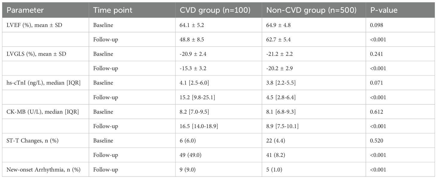 Our primary endpoint, trastuzumab-induced cardiotoxicity (TIC), was defined according to the 2022 ESC Guidelines on cardio-oncology (24). The composite endpoint included the occurrence of any of the following during follow-up: (1) Cancer Therapy-Related Cardiac Dysfunction (CTRCD): A new reduction in LVEF of >10 percentage points to an absolute value of <50% (symptomatic or asymptomatic); (2) Subclinical Cardiac Dysfunction: A relative percentage reduction in LVGLS of >15% from baseline; (3) Significant Arrhythmia: New-onset and sustained atrial fibrillation, ventricular tachycardia, or high-grade atrioventricular block; (4) Myocardial Injury: Elevation of cardiac hs-cTnI above the laboratory’s 99th percentile ULN. For this study, patients meeting any of these criteria were classified into the CVD group.
