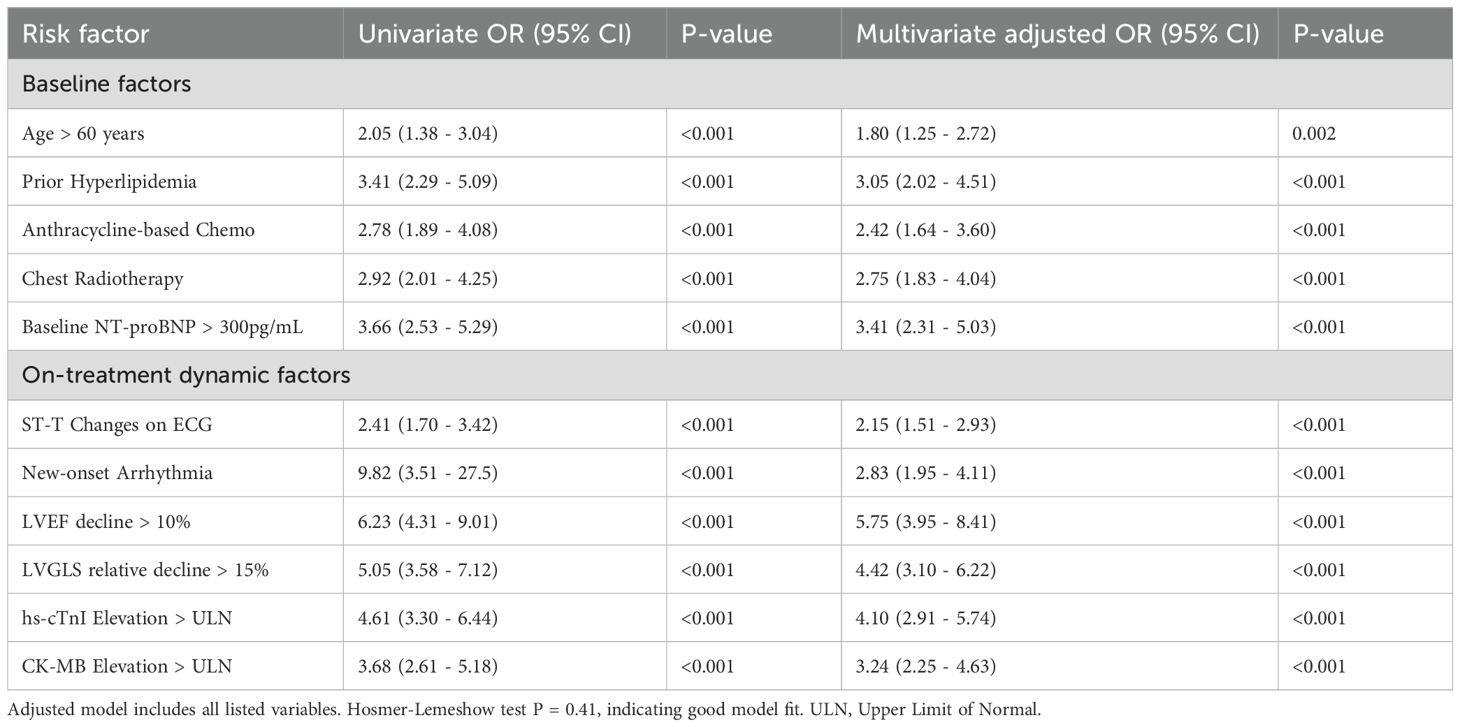 The standout finding of our study is the superior predictive value of dynamic monitoring markers. It is important to distinguish between baseline predictors and on-treatment markers. Baseline factors such as age, comorbidities like hyperlipidemia, and planned treatments like anthracycline use serve as true predictors of future risk before therapy initiation. In contrast, on-treatment changes, such as a >15% relative drop in LVGLS from baseline, function as powerful real-time markers indicating subclinical myocardial injury is actively occurring. This decline in LVGLS was a powerful predictor of cardiotoxicity, consistent with a growing body of evidence (29–31). LVGLS detects subtle myocardial dysfunction before changes in LVEF occur, offering a crucial window for intervention. While LVGLS measurements can be subject to inter-operator and inter-vendor variability, these limitations were minimized in our study through standardized equipment and assessment by experienced, blinded core lab cardiologists (32). Other advanced echocardiographic parameters, such as left ventricular (LV) diastolic function and volumes, also provide valuable prognostic information but were not systematically included in our primary analysis, representing an area for future investigation. Similarly, the elevation of hs-cTnI post-treatment was a strong predictor, signifying myocyte injury, a finding that aligns with previous landmark studies (26, 33). Our comprehensive model, achieving an AUC of 0.88, illustrates the power of a multi-parameter approach for personalized risk stratification.
