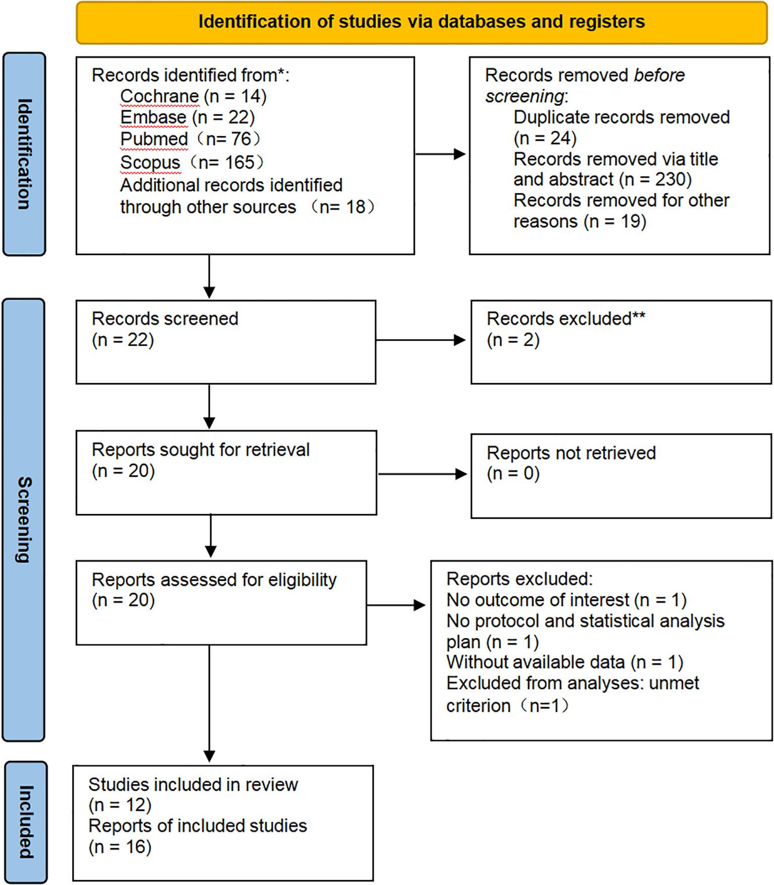 Flowchart depicting the process of identifying studies via databases and registers. Identification includes records from Cochrane (14), Embase (22), Pubmed (76), Scopus (165), and other sources (18). Records removed before screening: duplicates (24), by title/abstract (230), other reasons (19). Screening involves records screened (22), with 2 excluded. Retrieval sought for 20, none not retrieved. Assessed for eligibility: 20, 4 excluded due to lack of interest, no protocol, unavailable data, unmet criteria. Finally, 12 studies included in review, with 16 reports total.