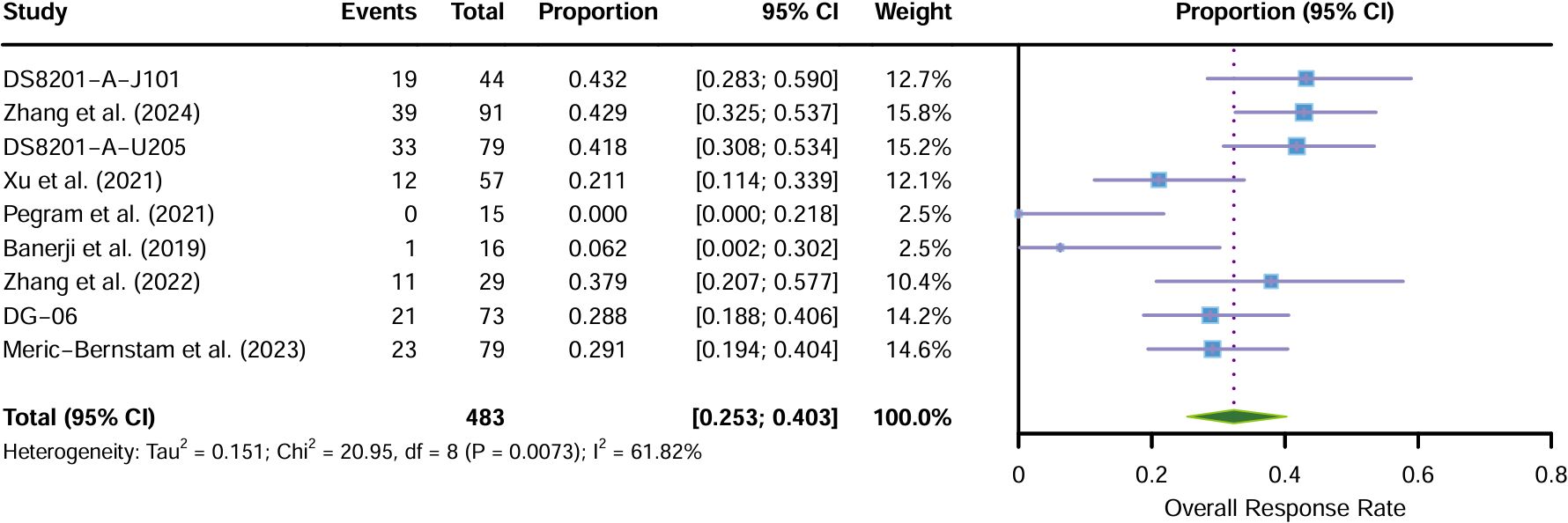 Results: Twelve studies comprising 1041 patients were included. The pooled ORR across all ADCs was 33.4% (95% CI, 26.3%–41.3%). Efficacy varied substantially among agents: trastuzumab deruxtecan (T-DXd) and DP303c demonstrated the highest ORRs (42.5% and 42.9%, respectively), whereas others, such as Trastuzumab emtansine (T-DM1), showed lower efficacy (20.6%). ORR was not significantly affected by prior treatment lines (P = 0.6559) or cohort type (P = 0.7185). The most common adverse events included nausea (47.7%), with grade ≥3 anemia (21.1%) and neutropenia (15.1%) being the most frequent severe toxicities.