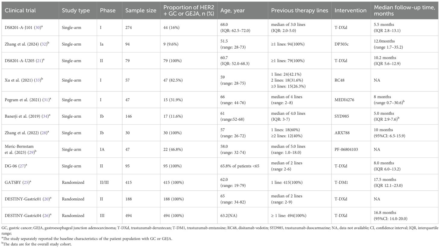 Our study evaluated patients with locally advanced or metastatic GC who received ADC monotherapy. The intervention protocol involved ADC drugs including T-DXd, Trastuzumab emtansine (T-DM1), DP303c, RC48, MEDI4276, SYD985, A166, ARX788, PF-06804103. Table 1 reports the main trial characteristics.