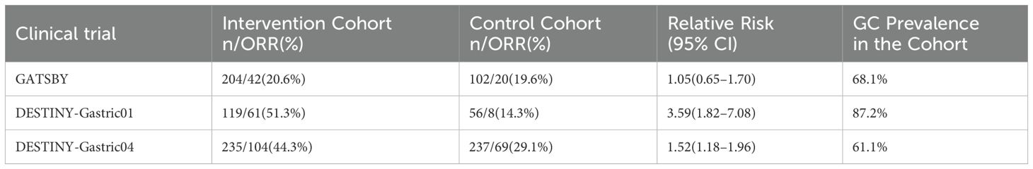 A descriptive analysis of ORR data from three RCT studies (GATSBY, DESTINY-Gastric01, DESTINY-Gastric04) is reported in Table 2. The overall ORR of the intervention group (37.1%, 207/558) performed better than that of the control group (24.6%, 97/395). Notable variation in efficacy was observed across trials, with the DESTINY-Gastric01 intervention group (51.3%, 61/119) demonstrating the largest improvement in ORR compared with the control group (14.3%, 8/56). A potential correlation between GC ratio and ORR improvement was noted. The most significant ORR advantage was observed in DESTINY-Gastric01 with the highest GC ratio, while the efficacy difference in GATSBY with a lower GC ratio and DESTINY-Gastric04 was relatively convergent (Supplementary Figures S1A–C). These findings suggest that the intervention program may have a more prominent clinical benefit for people with specific pathological characteristics (such as high GC ratio).