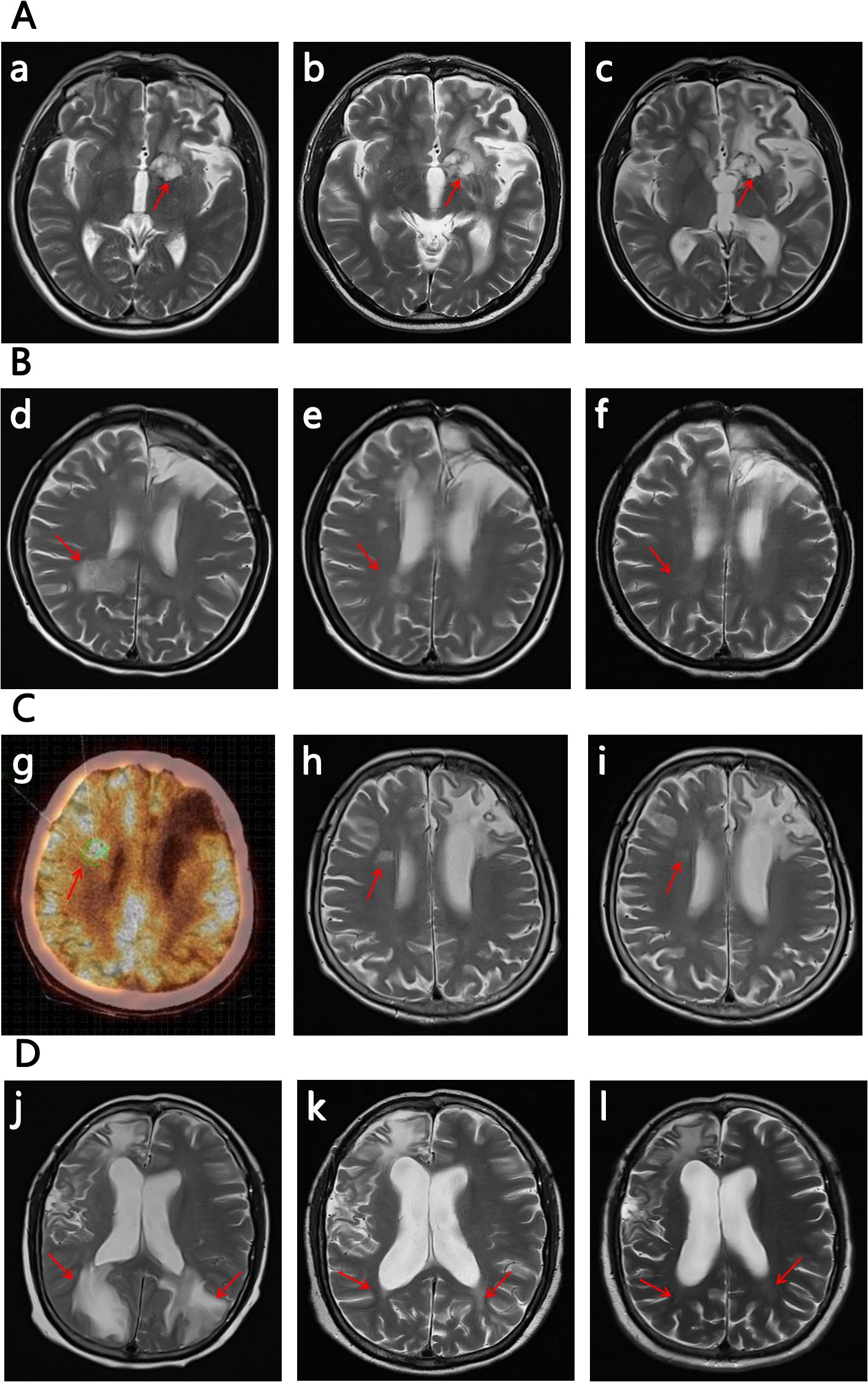 Figure 1. The images of the 4 R/R CNSL patient (the subfigure g was by PET-CT, while others were all by MRI). The significant decrease in the size and contrast enhancement of the CNS lesion (arrows) on T2-weighted post-gadolinium contrast axial images show the response to the treatment (for subfigure g the arrow indicates the location of relaspsed tumor). The positions pointed by the arrows are the locations of the tumor, and the other abnormalities on the images are due to the craniotomy. (A) No.1 patient: (a) on 2024/12/02 at relapse before the therapy of glofitamab combined with lenalidomide; (b) on 2025/02/15 after 2 cycles of the therapy; (c) on 2025/04/02 after 4 cycles of the therapy. (B) No.2 patient:(d) on 2024/10/19 at relapse before the therapy of glofitamab combined with lenalidomide; (e) on 2024/12/05 after 2 cycles of the therapy; (f) on 2025/01/25 after 4 cycles of the therapy. (C) No. 3 patient: (g) a PET-CT scan on 2024/12/02 at relapse before the therapy of glofitamab combined with lenalidomide; (h) on 2025/01/14 after 2 cycles of the therapy; (i) on 2025/03/07 after 4 cycles of the therapy. (D) No. 4 patient. (j) on 2025/03/28 at relapse before the therapy of glofitamab combined with lenalidomide; (k) on 2025/05/15 after 2 cycles of the therapy; (l) on 2025/06/23 after 4 cycles of the therapy.
