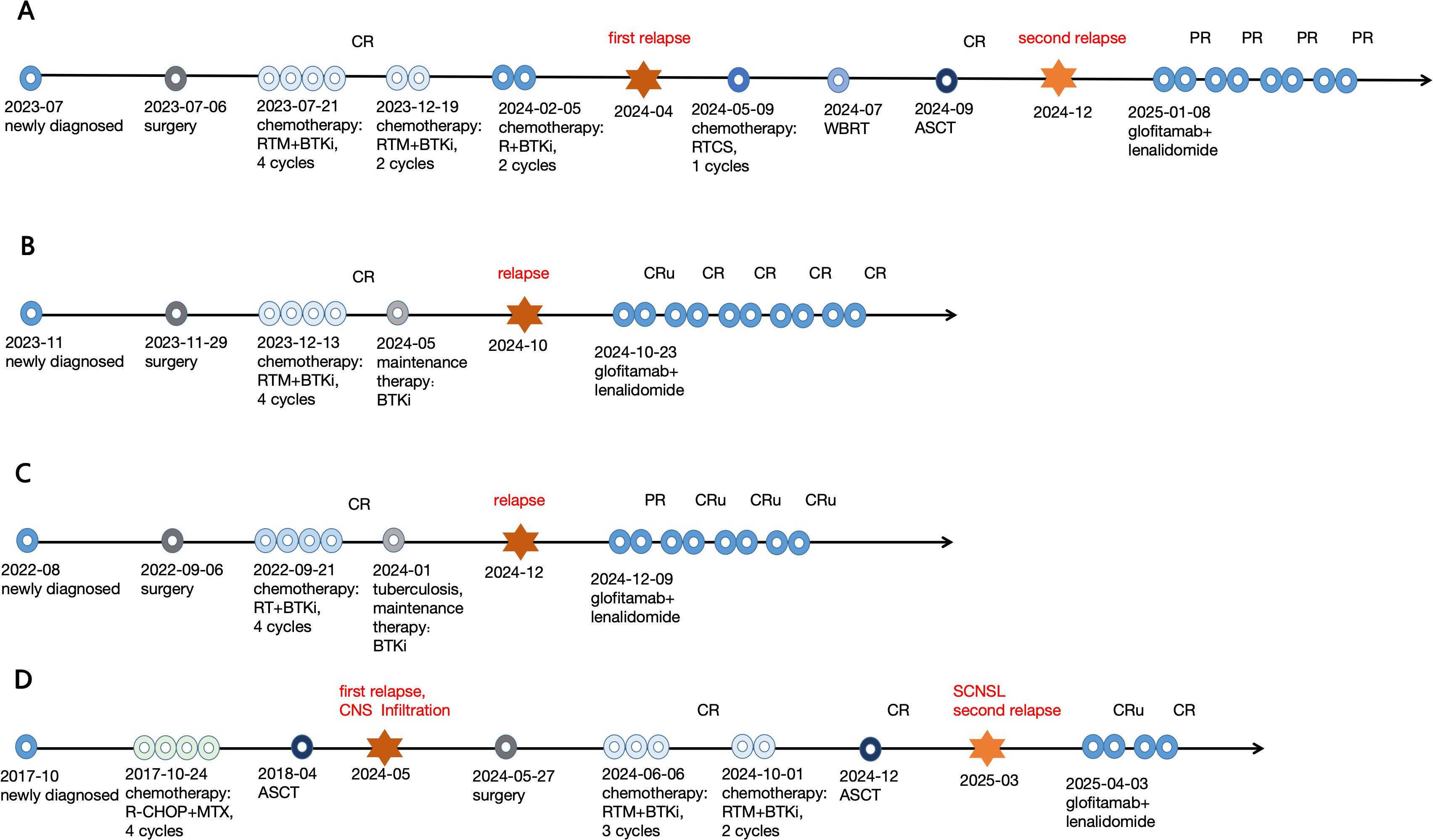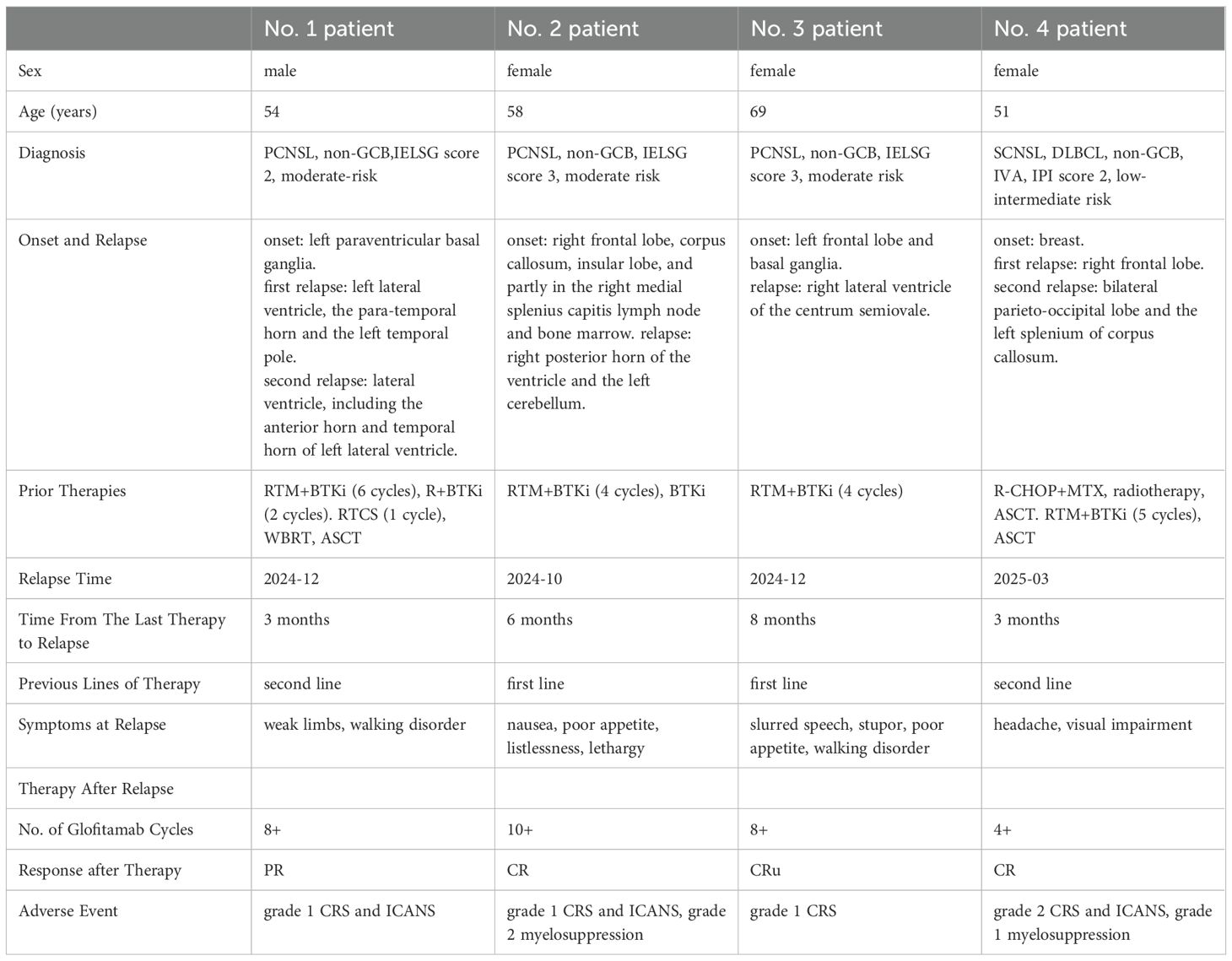 The No.4 patient was a 51-year old woman with SCNSL. Eight years ago, she had a primary breast DLBCL, and received ASCT after 4 cycles of chemotherapy with R-CHOP combined with MTX. In 2024-05, she developed epilepsy and consciousness disturbance without any obvious cause. Imaging examination showed a tumor in the right frontal lobe of her brain. Then, a total body positron emission tomography-computed tomography (PET-CT) showed manifestations of only the intracranial tumor but no manifestations of tumor at other locations. Craniotomy and biopsy were performed and the result confirmed a DLBCL. Eight years ago, the next generation sequencing was applied to the breast tumor of the patient, and this time, the next generation sequencing was applied again to the intracranial tumor as well. The results are nearly the same. Therefore, a recurrence of previous DLBCL was considered. She then received 3 cycles of RTM+BTKi (rituximab 375mg/m2 d1, thiotepa 30mg/m2 d2, methotrexate 3.5g/m2 d3, orelabrutinib 150mg qd) chemotherapy and achieved CR. After that she received another 2 cycles of RTM+BTKi chemotherapy and then received ASCT again. But unfortunately, in 2025-03, 3 months after ASCT, she went to hospital complaining of headache and visual impairment, and lymphoma lesions were found recurred in her bilateral parieto-occipital lobe and the left splenium of her corpus callosum. At the second relapse, glofitamab plus lenalidomide were given for treatment. She achieved CR after 4 courses of treatment (Figure 1). During the first cycle of glofitamab, she once had fever, hyoxemia, and lethargy, which were recorded as grade 2 CRS and ICANS, Besides, she also had grade 1 myelosuppression. These symptoms were relieved after dexamethasone and symptomatic treatment. So far, she is still in CR and in the process of therapy with glofitamab combined with lenalidomide.