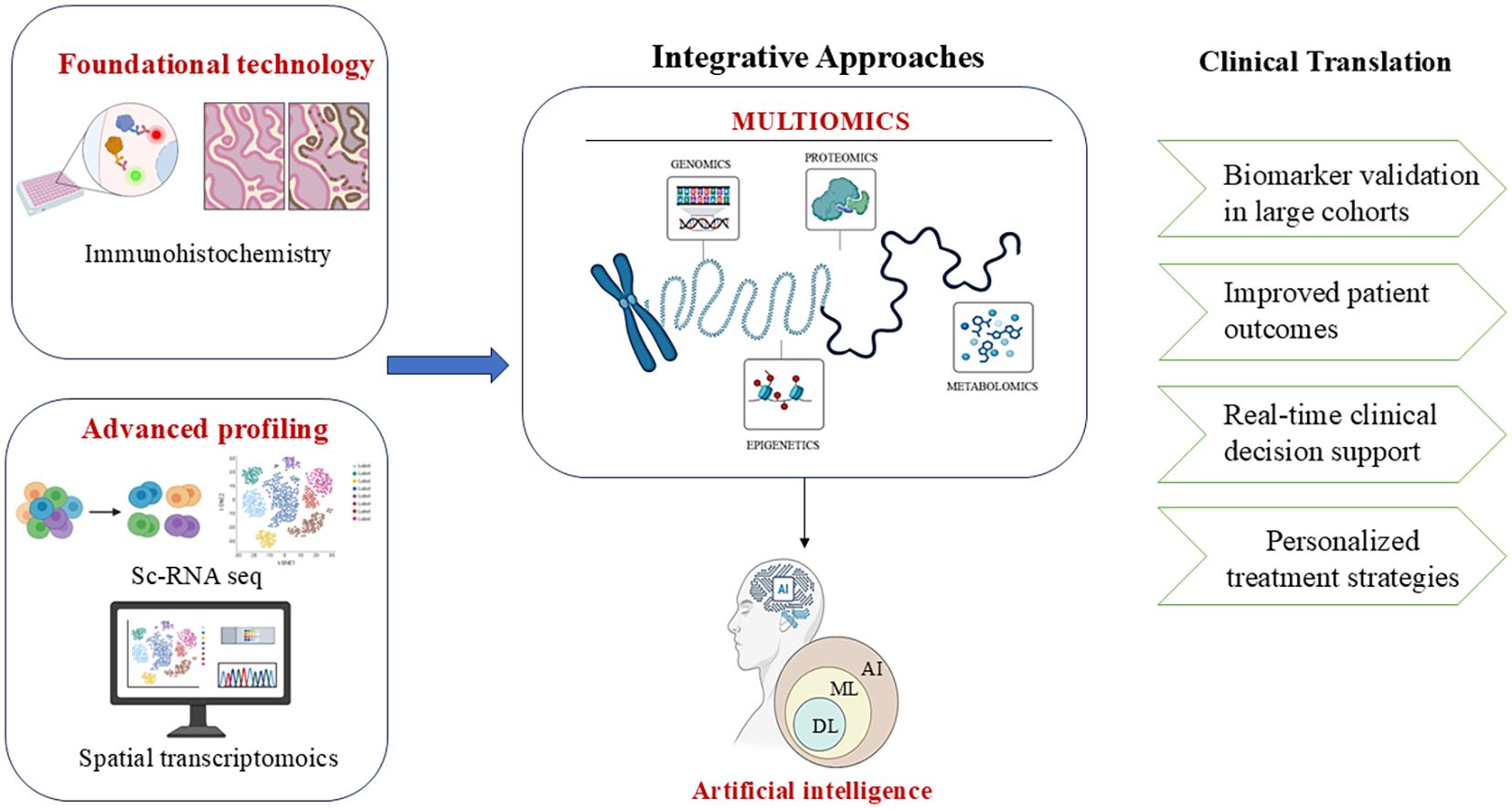 IHC remains an essential tool to validate molecular findings and guide clinical diagnostic workflows, while scRNA-seq has identified diverse immune and epithelial cell states, highlighting potential therapeutic targets. Spatial transcriptomics has provided crucial spatial context to these cellular interactions, enhancing biomarker identification for patient stratification. Moreover, these approaches pave the way toward personalized treatment strategies by gaining a comprehensive view into the mechanisms of treatments, their role in causing resistance, and immune landscape characterization. Collectively, these new molecular insights help in refining the diagnostic approaches, prognostic tools, and can also be utilized as predictive tools for patient stratification for therapies, including immunotherapy.