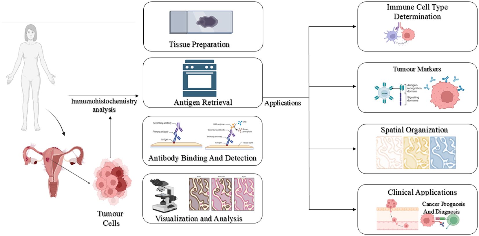 In cancer, IHC revolutionized diagnostic and prognostic routines (19). It facilitates the detection of tumour-specific proteins, differentiation between benign and malignant lesions, and classification of cancer subtypes and stages. Apart from diagnosis, IHC helps in the evaluation of drug action by uncovering changes in therapeutic targets and downstream signalling molecules (20). Using particular histochemical markers, it helps in tumour grade and stage determination and assists cell-type deconvolution in complicated tissue microenvironments (17, 21). In the TME, where heterogeneous immune, stromal, and malignant cells interact with each other, it further plays a role in differentiating among cell populations expressing identical proteins according to their spatial distribution and density (22, 23).