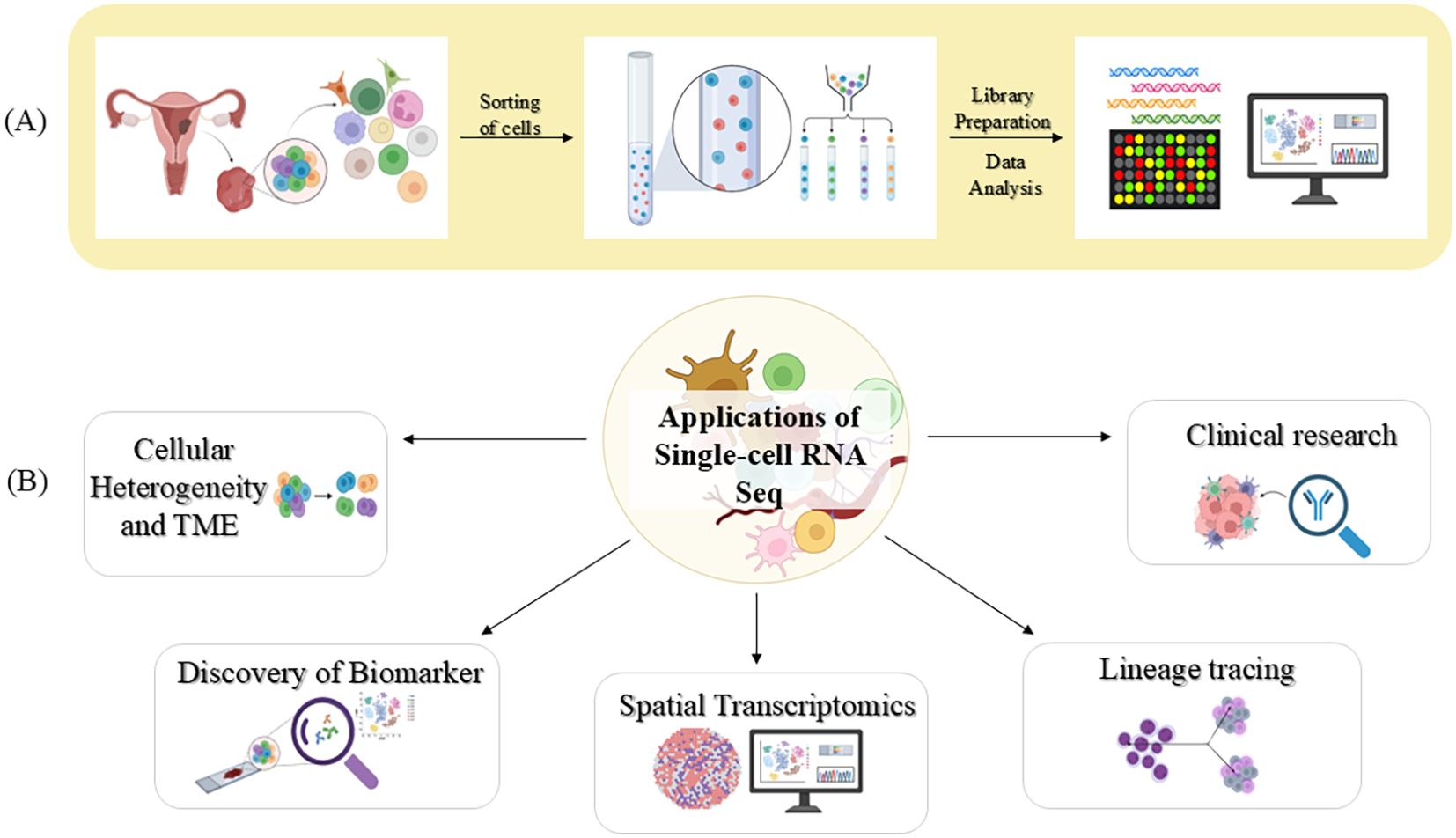Figure 3. A visual representation of scRNA-seq technique and its contribution in biomedical research (A) Workflow of scRNA-seq (B) Key applications of scRNA-seq. Image created by BioRender (13).
