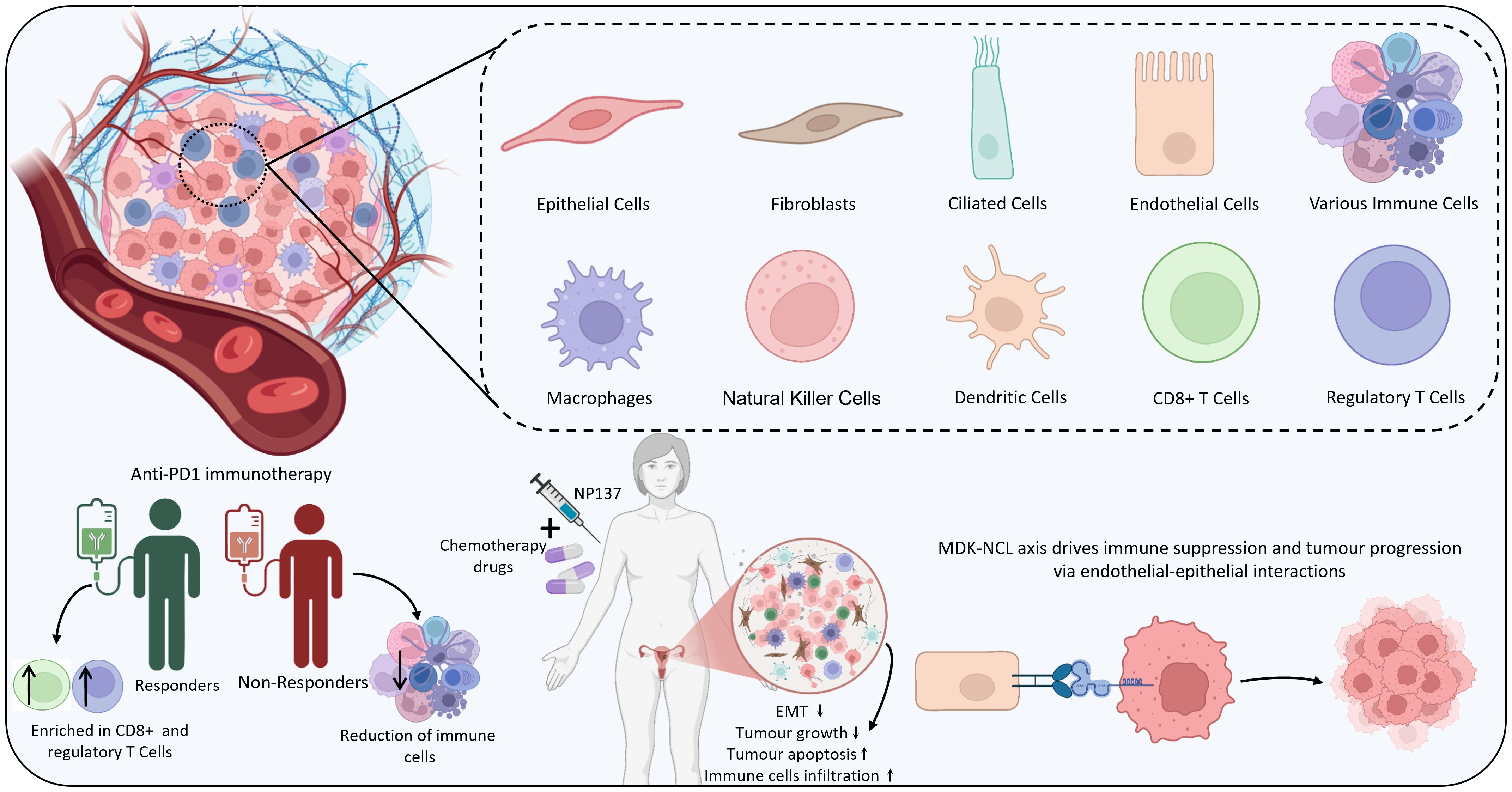 TME, Tumour Microenvironment; IHC, Immunohistochemistry; scRNA-seq, Single-Cell RNA Sequencing; ST, Spatial Transcriptomics; EC, Endometrial Cancer; HSCs, Haematopoietic Stem Cells; FIGO, The International Federation Of Gynaecology and Obstetrics; scATAC-seq, Single-Cell Assay For Transposase-Accessible Chromatin; MSI-H, Microsatellite Instability; EMT, Epithelial-To-Mesenchymal Transition; TCGA, The Cancer Genome Atlas Program; MMRs, Mismatch Repair Proteins; DM, Diabetes Mellitus; MDK, Midkine; NCL, Nucleolin; LIUD, Levonorgestrel Intrauterine Device; EEC, Endometrioid Endometrial Cancer; AH, Atypical Hyperplasia; USCs, Uterine Serous Carcinoma; Tregs, Regulatory T cells; PD-1, Programmed cell death protein 1.