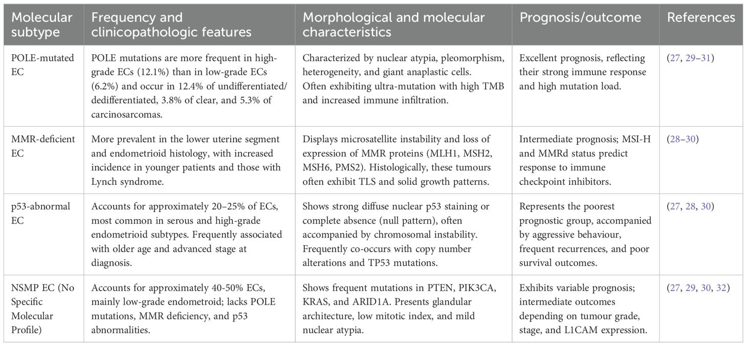 In endometrial cancer, IHC is still among the most commonly used methods for evaluating tumour biology. In contrast to transcriptomic methods that give expression information without spatial reference, IHC provides direct visualization of protein localization and abundance within tissue sections. Thus, it maintains the architectural integrity of the tissue as well as that of the surrounding microenvironment – enabling correlation of molecular alterations with tissue morphology (24). To explore whether molecular types have an impact on tumour morphology, a study was conducted to analyse immune contexture in a cohort of primary, untreated EC, correlating morphological data with TCGA-defined molecular subgroups (POLE-mutant, p53 mutant, MSI, and NSMP). The study revealed MSI tumours with MLH1/PMS2 defects and high-grade POLE-wildtype/MSS tumours expressing high immunogenicity characterized by intense T-cell infiltration, especially at the invasive edge. High density of regulatory T cells (Tregs) was a prognostic indicator of poor outcome in p53-mutant EC, whereas WHO grade continued to be the primary prognostic factor in NSMP EC. In conclusion, the combination of molecular subtype, morphology, and immune context provides a more accurate insight into EC behaviour and prognosis (25). The TME plays a vital role in tumour formation and prognosis. It is also equally responsible for metastasis. To improve diagnostic precision, staging, and disease management, an updated version of EC staging was released by FIGO in 2023 (26). The revised staging incorporated molecular insights into its framework, which was enhanced by IHC-based key biomarkers, particularly mismatch repair (MMR) proteins and p53, forming the base of a better stratification approach (27, 28). Table 1 depicts the Histo-molecular classification of EC.