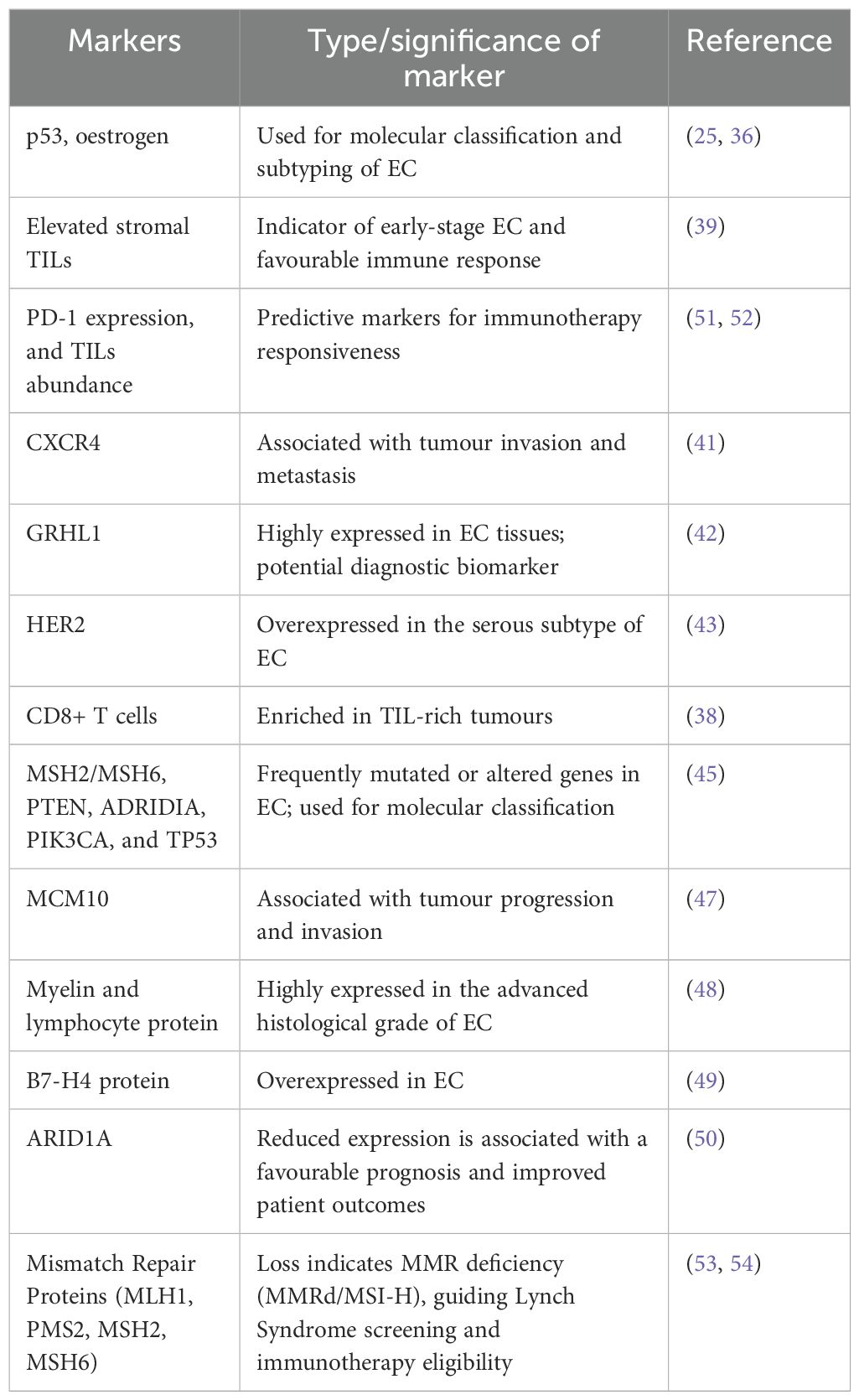 In modern EC research, IHC has moved from being a merely diagnostic tool to being a critical validation platform for computational and high-throughput investigations of the TME. Staining tissue samples with antibodies specific to various proteins can facilitate the visualization and quantification of immune cell infiltration, expression of immune checkpoints, and other key features. This experimental data can be directly compared to computational studies, adding value to the accuracy and reliability of the computational analysis (46). For example, IHC confirmation helped to validate the computationally predicted MCM10 in EC progression—demonstrating high concordance between the elevated protein expression and tumour invasiveness. The findings indicate that MCM10 serves as a poor prognostic marker in EC, as its overexpression is associated with tumour progression, aggressive clinicopathological features, and reduced overall survival, suggesting that MCM10 may promote EC development and could be a potential therapeutic target (47). Similarly, the functional significance of Myelin and lymphocyte protein (MAL) within the context of EC remained largely unaddressed. Hence, a computational study (differentially expressed genes, GSVA) was performed, and IHC was employed to validate the study. Sequential probing using primary anti-MAL antibody, then a secondary antibody, indicated a positive correlation between MAL expression and advanced histological grade (48). Likewise, IHC validated the overexpression of immune checkpoint protein B7-H4 in various solid cancers, such as EC. The SGN-B7H4V antibody–drug conjugate exhibited strong antitumor activity in vitro and in vivo, which underscores the translational relevance of IHC-validated targets (49). Furthermore, integrated genomic and IHC analyses of proteins including ARID1A, CD3, CD8, and MMR showed that deficiencies in DNA repair and high levels of TILs, frequently correlated with low ARID1A expression, might be the basis for the good prognosis reported in some EC subtypes (50). Together, these results depict IHC as a foundation technique not just for prognostic and diagnostic classification but also to combine molecular, spatial, and computational information. Its ability to associate cellular localization with molecular information still bridges conventional pathology with next-generation omics, paving the way for accurate immunophenotyping and individualized therapeutic design in endometrial cancer. The clinical relevance of key immunohistochemical markers in EC is tabulated in Table 2.