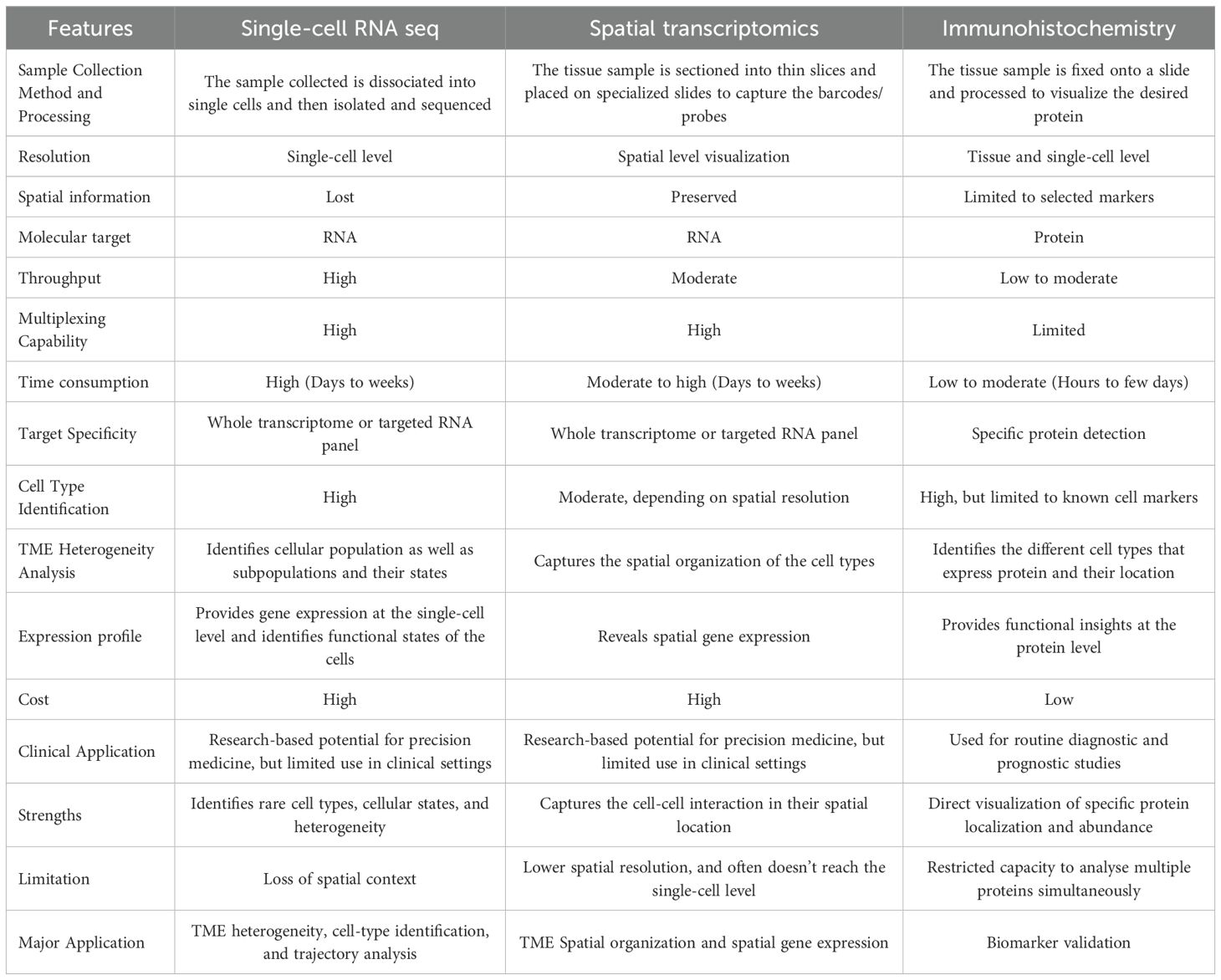 However, certain potential limitations need to be investigated. IHC, though cost-efficient, offers only a limited snapshot of the TME, potentially overlooking key cellular interactions and heterogeneity. These constraints are overcome by scRNA-seq, which provides the complete picture of the tumour microenvironment and uncovers complex cell-cell interactions. Nonetheless, scRNA-seq fails to maintain the spatial integrity within the tissue. This shortcoming is overcome by ST, which preserves tissue architecture and allows visualization of cellular organization in situ. Despite its advantages, the broader adoption of ST remains restricted due to its requirement for specialized equipment, advanced analytical expertise, and high operational costs, which can limit accessibility and scalability. Nevertheless, ongoing technological improvements and cost reductions are expected to broaden their application.
