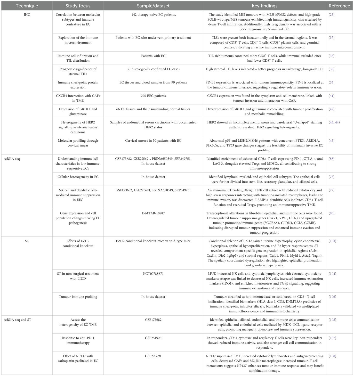 Several studies emphasize integrating both scRNA-seq and ST to get a comprehensive view of the TME. A study investigating the heterogeneity of EC identified various cells, including epithelial cells, ciliated cells, endothelial cells, and immune cells, using scRNA-seq and ST. Furthermore, the results emphasized the communication between epithelial and endothelial cells mediated by the MDK (Midkine) and NCL (nucleolin) ligand-receptor pair that was found to promote malignant phenotypes and immune suppression in the TME. ST evidently highlighted that MDK was highly expressed predominantly in epithelial and ciliated cells and that the MDK-NCL interaction occurs in specific tissue regions, contributing to immune suppression and tumour progression (105). Furthermore, another study uncovered that employing ST, tumours could be stratified into hot, intermediate, and cold based on the immune profiles that are associated with CD8+ T cell infiltration. Further, potential biomarkers such as HLA class I, CD8, and DNMT3A were also identified, which assist in the prediction of immune checkpoint inhibitor therapeutic efficacy. These biomarkers were also validated using multiplexed immunofluorescence and immunohistochemistry (106). Interestingly, spatial transcriptomics also offers insights into the resistance or sensitivity mechanism of a treatment. For instance, a study on patients receiving anti-PD-1 immunotherapy unveiled that in the responders, CD8+ cytotoxic and regulatory T cells played key roles, whereas in non-responders, a reduction of immune activity was noticed. Additionally, the cell-cell communication within the TME of the responder was stronger than the non-responder. The ligand-receptor interactions, including CD74–APP, CD74– MIF, and CD74–COPA, were revealed to associate with CD8+ cytotoxic cells, regulatory T cells and others (107). Similarly, integrating ST with scRNA-seq and bulk RNA-seq across pre- and post-treatment samples aids in gaining comprehensive insights into the therapeutic mechanisms and potential predictors, paving the way for personalised treatments. ST, along with scRNA-seq, revealed that NP137, an anti-netrin-1 antibody, with carboplatin-paclitaxel helps in the reduction of epithelial-to-mesenchymal transition (EMT) conversion in EC. Also, the TME showed increased cytotoxic lymphocytes and antigen-presenting cells, whereas decreased cancer-associated fibroblasts and M2-like macrophages. Specifically, there was an increase in the strength of interaction and the number among the tumour and T cells. Altogether, these findings suggest that NP137 may enhance the tumour immune response, potentially through its influence on EMT. Given the growing evidence linking EMT to therapeutic resistance—particularly against chemotherapy and immune checkpoint inhibitors—the ability of NP137 treatment to suppress EMT-associated features highlights its promise for combination therapy (108). Findings from scRNA and ST are summarized in Figure 5. Table 4 provides a summary of key findings from studies concerning IHC, single-cell, and spatial profiling approaches in EC. On the other hand, Table 5 highlights the major applications of the three techniques.
