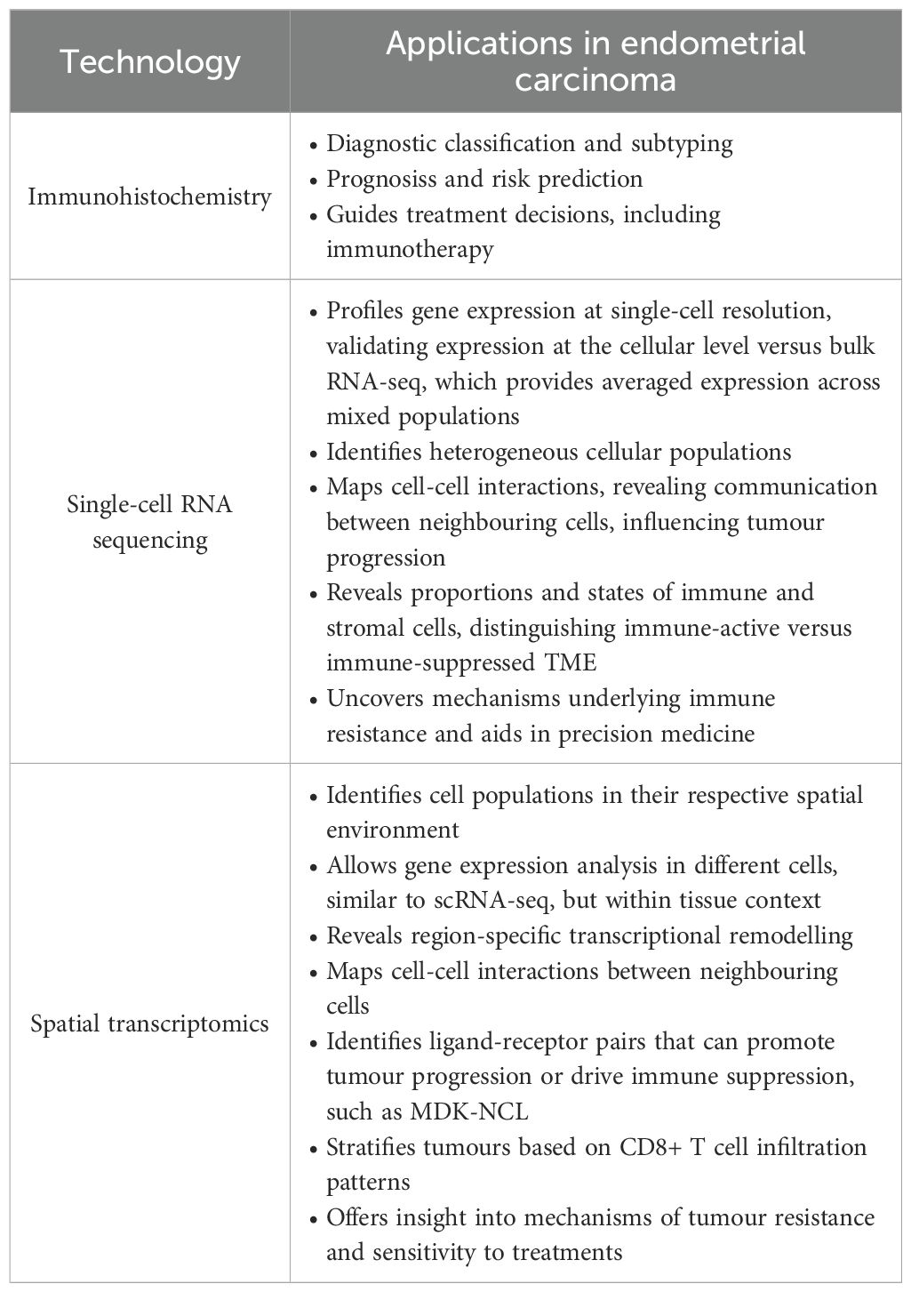 However, as EC research progresses toward greater resolution of tumour ecosystems, there is an urgent need to overcome the analytical constraints of IHC. While IHC provides insightful single-marker and low-plex information, it does not possess the resolution to elucidate transcriptomic heterogeneity, cellular plasticity, and intercellular communication that characterize the EC TME. To solve this, researchers have increasingly relied on single-cell RNA sequencing (scRNA-seq) and spatial transcriptomics (ST)—technologies with the ability to profile thousands of genes at the resolution of single cells while maintaining spatial context. Next-generation tools offer an unprecedented ability to analyse cellular heterogeneity, map lineage evolution, and define molecular pathways within the tissues’ native environment. Here, IHC has become a confirmatory and complementary method of validation, confirming protein-level expression and spatial localization of primary targets delineated by scRNA-seq and ST analysis (55–57). In combination, they constitute a synergistic platform that couples spatial resolution with molecular depth, making holistic insight into endometrial cancer microenvironment and translational relevance to personalized medicine.