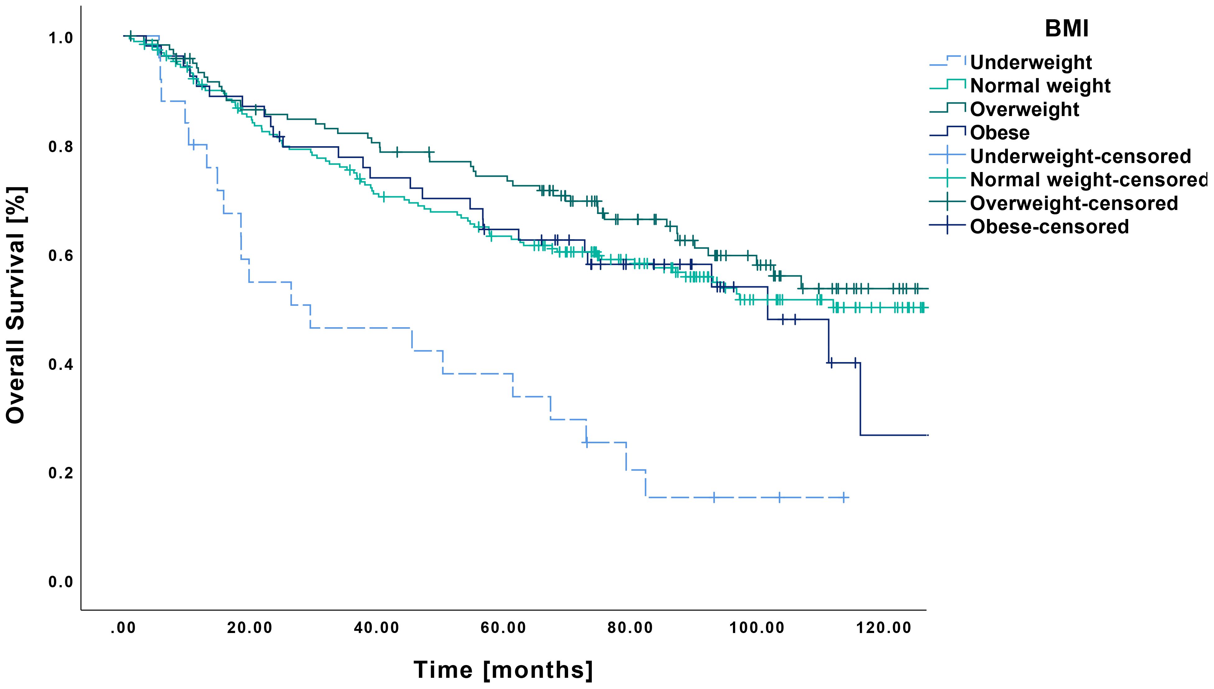 The Kaplan–Meier analysis revealed a mean OS of 46.0 months (CI: 30.9-61.2 months) in underweight patients, which was significantly lower than that of normal weight (89.4 months CI: 81.8-97.0 months, p<0.001), overweight (97.4 months CI: 88.4-106.5 months, p<0.001) and obese patients (83.0 months CI: 70.3-95.8 months, p<0.001) (Figure 1). The 5-year survival rates, in the order mentioned before, were 39%, 64%, 74%, and 64%, respectively.