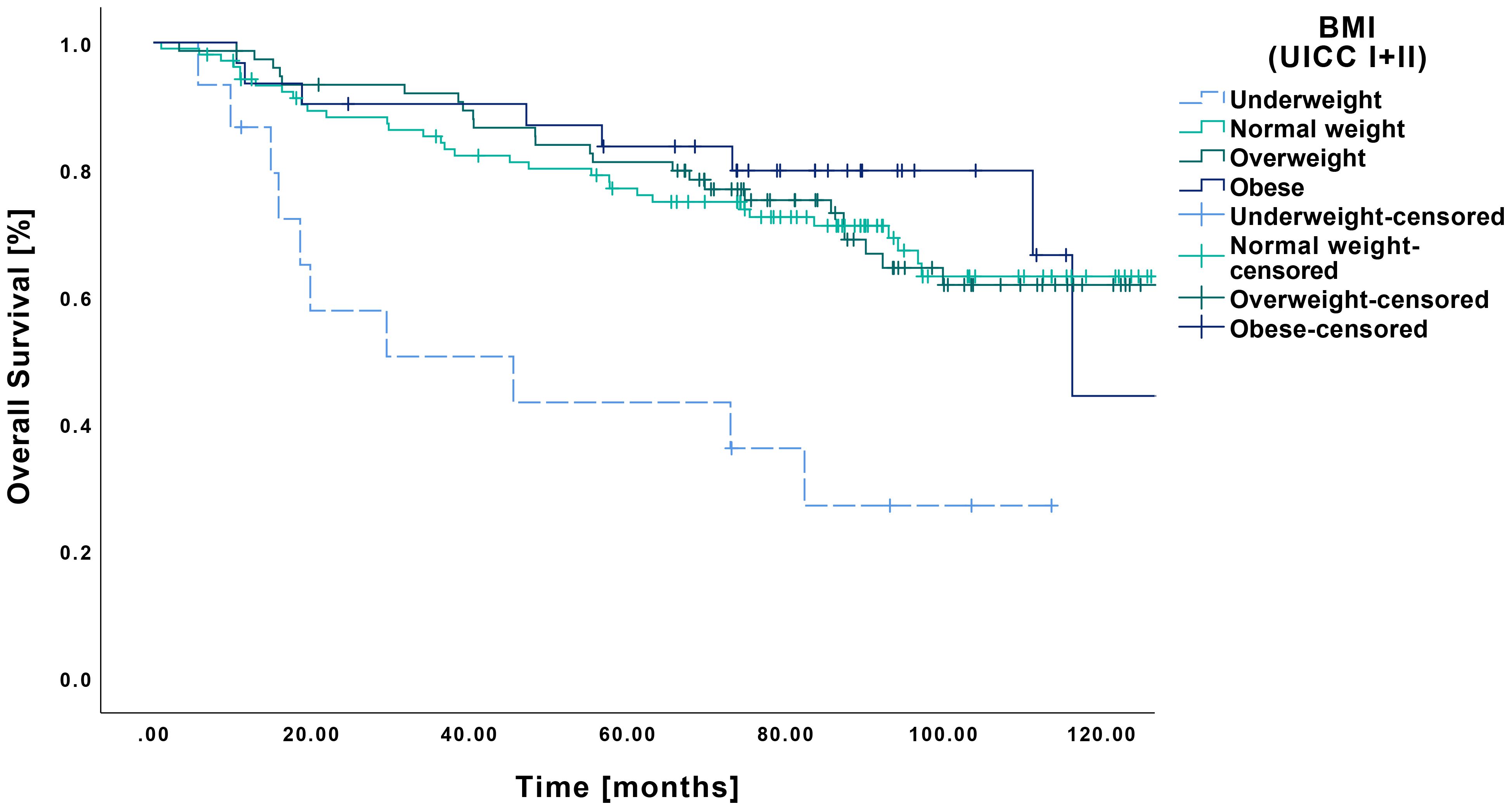 Figure 3. Kaplan-Meier curves showing OS of early-stage OSCC (UICC I and II) in relation to pretherapeutic BMI. Underweight patients (n=15) showed a significantly lower OS compared to normal weight (n=105, p<0.001), overweight (n=76, p<0.001), and obese patients (n=31, p<0.001).