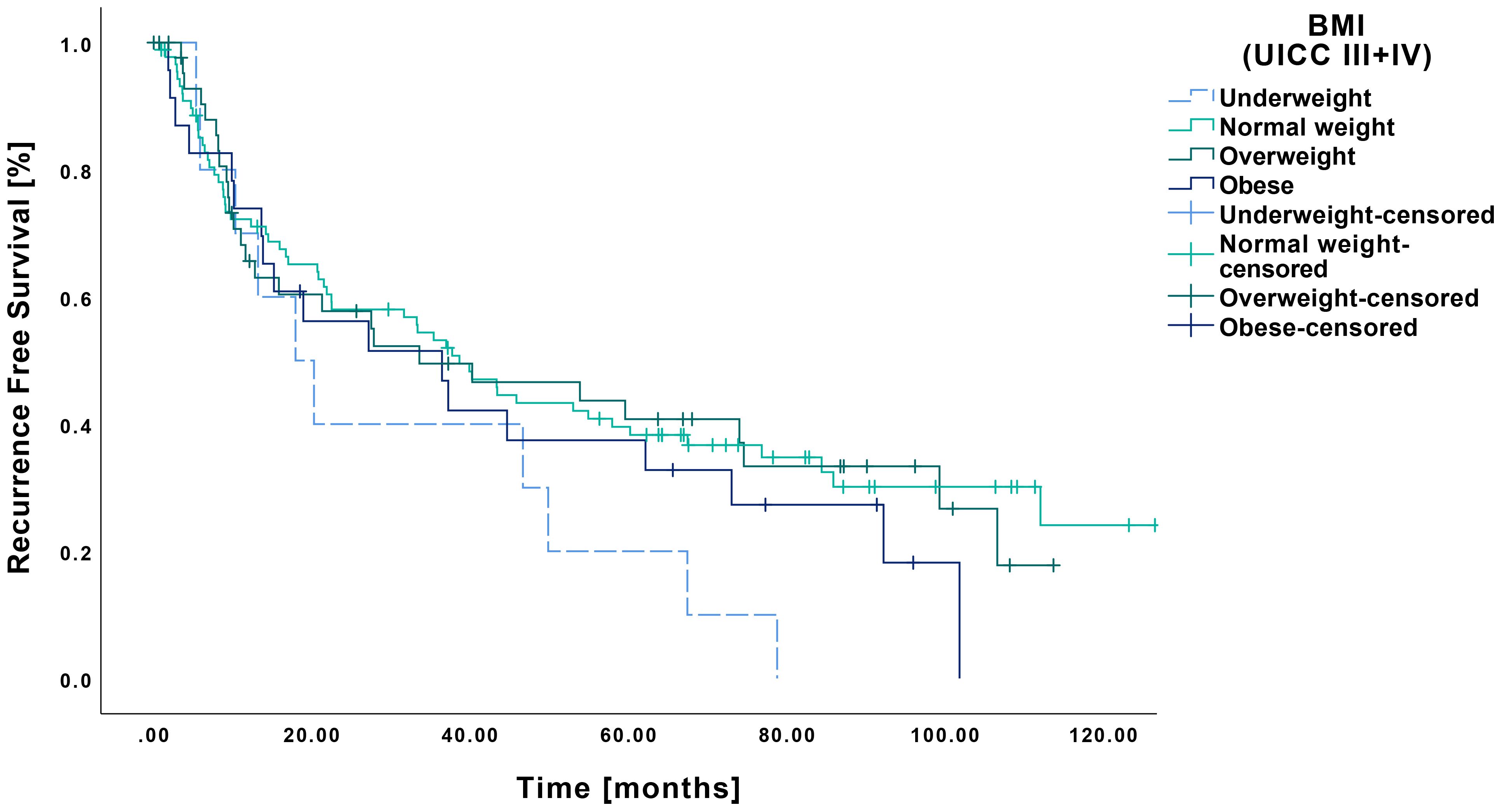 Figure 6. Kaplan-Meier curves showing RFS of late-stage OSCC (UICC III and IV) in relation to pretherapeutic BMI. Patients classified as underweight (n=10) demonstrated no significant differences regarding RFS compared to those with normal weight (n=89, p=0.073), overweight (n=45, p=0.093) or obesity (n=23, p=0.247).