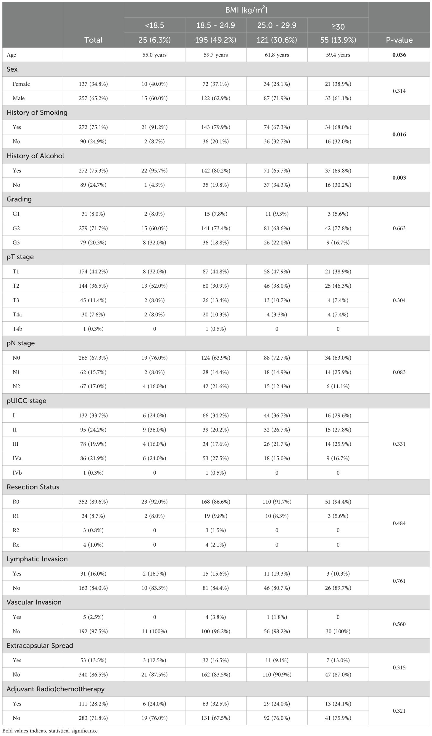 In our cohort, 25 patients (6.3%) were classified as underweight, 195 (49.2%) as normal weight, 121 (30.6%) as overweight and 55 (13.9%) as obese. As shown in Table 1, no statistically significant correlations were found between BMI and histopathological characteristics, including grading, T stage, N stage, or UICC stage. In contrast, BMI was significantly associated with age at the time of surgery, with underweight patients presenting at a younger age (p=0.036). Univariate analysis demonstrated a significant correlation between BMI and both smoking (Cramer-V: 0.169; p=0.016) and alcohol history (Cramer-V: 0.194; p=0.003), with a higher prevalence of these factors among underweight patients.