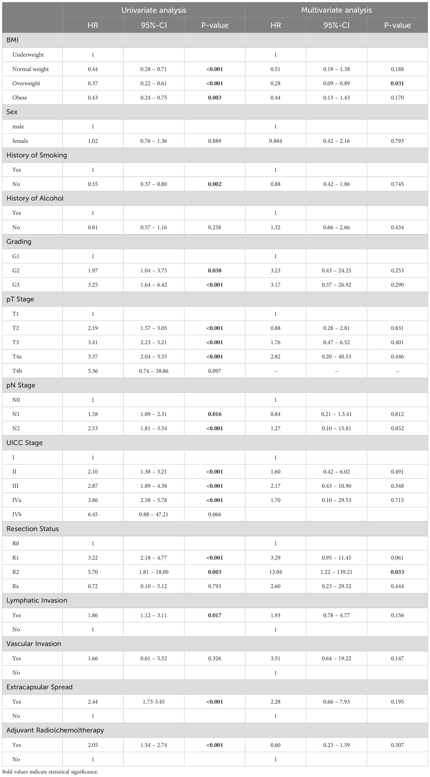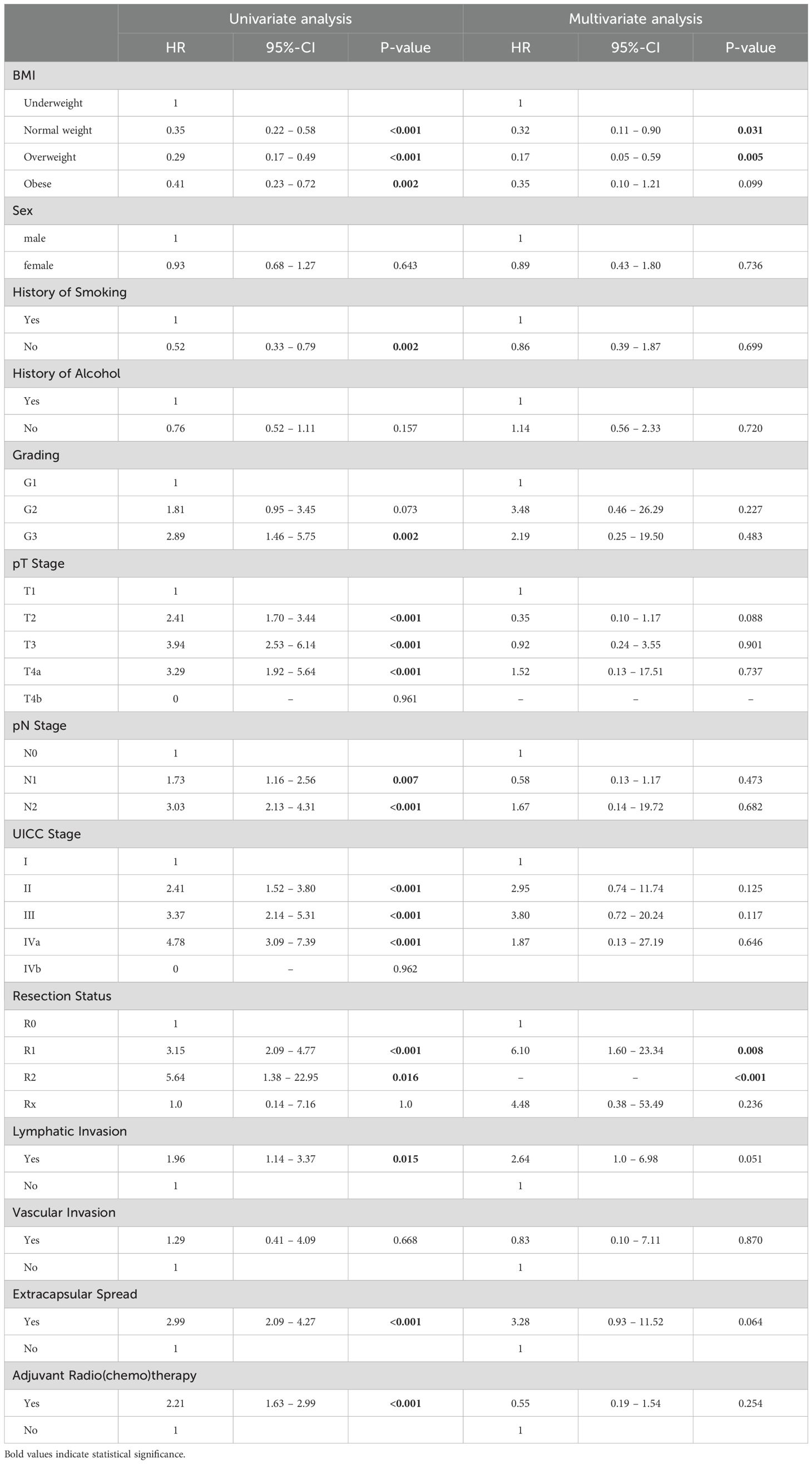Conclusion: Our results underscore the prognostic significance of pretherapeutic BMI as an independent risk factor in OSCC, particularly highlighting the need for intensified preoperative management in underweight patients due to their compromised outcomes.