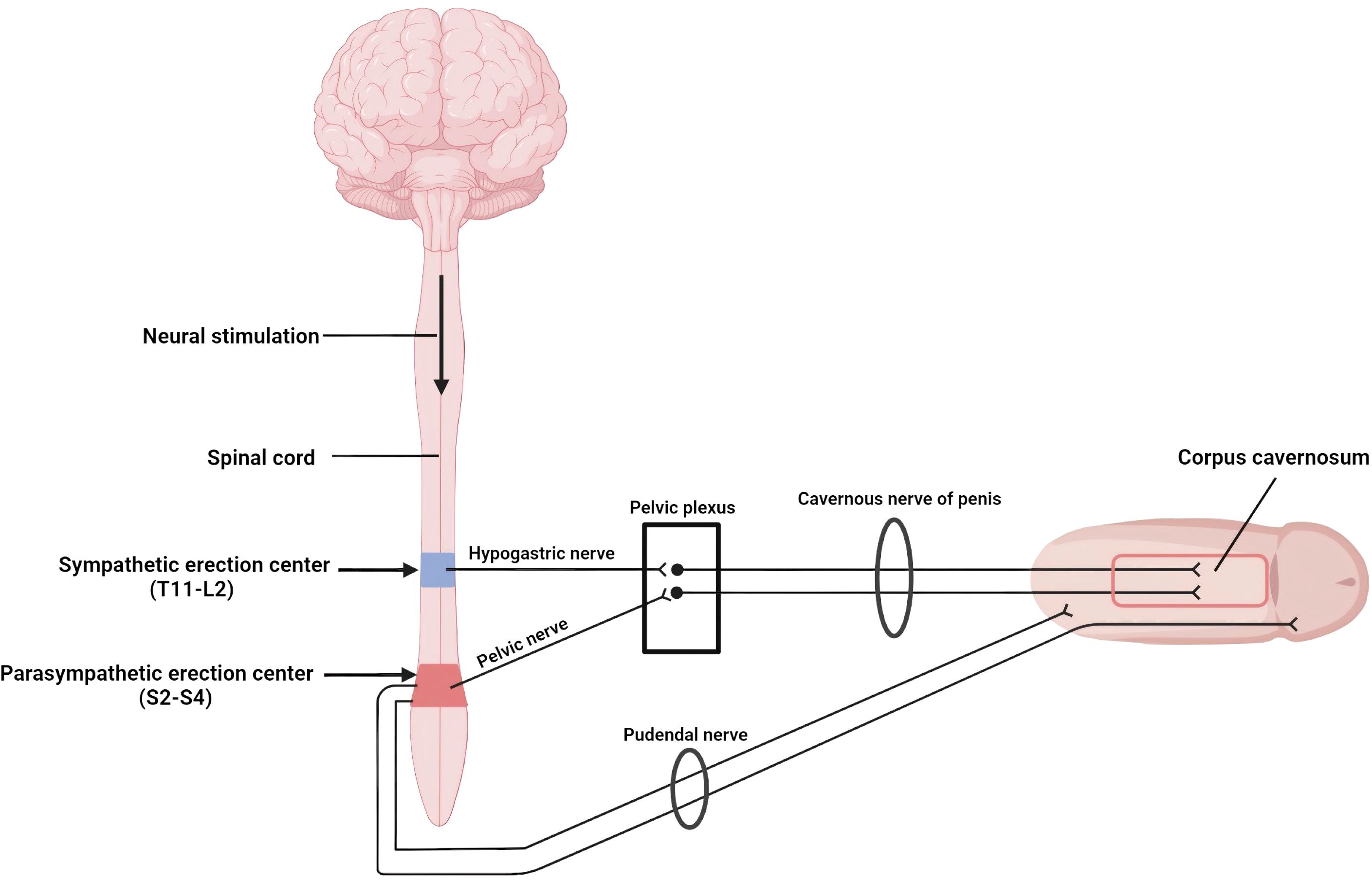 Figure 1. Neural pathways mediating reflex erection: Sympathetic fibers from T11mrs keep the penis flaccid, whereas parasympathetic fibers from S2omr trigger erection. Image created with BioRender.com.