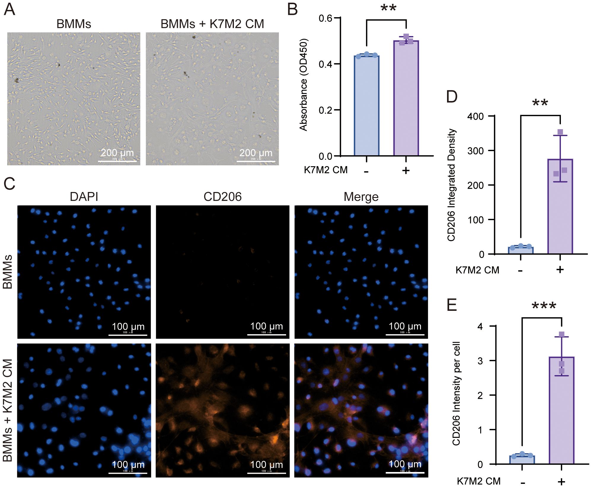 Figure 1. The morphology of bone marrow-derived macrophage (BMM) changes after co-culture with K7M2 conditional medium (CM). (A) Representative image in different groups after being fixed with 4% paraformaldehyde (PFA). Scale bar, 100 μm. (B) Cell viability of BMMs following a 48-h treatment with or without K7M2 CM, assessed by CCK-8 assay. (C) Representative immunofluorescence images of CD206-positive cells stimulated with or without K7M2 CM. (D–E) Quantification of CD206 immunofluorescence intensity. * p < 0.05, ** p < 0.01, *** p < 0.001.