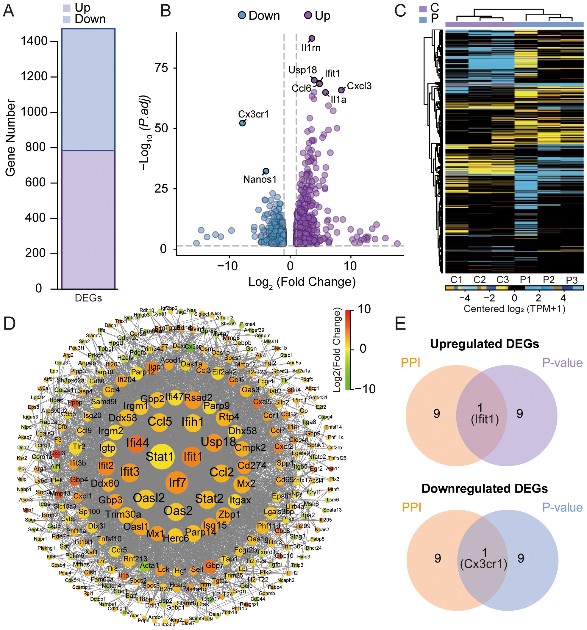 Figure 2. Analysis of differentially expressed genes (DEGs) by RNA sequencing. (A) Statistical bar chart of the differential expression analysis. (B) Volcano plots for DEGs between the K7M2 CM co-culture and control groups. (C) Clustering heatmap of DEGs. (D) Comparative Analysis of protein–protein interaction (PPI) networks. (E) Venn diagram for the upregulated and downregulated genes.