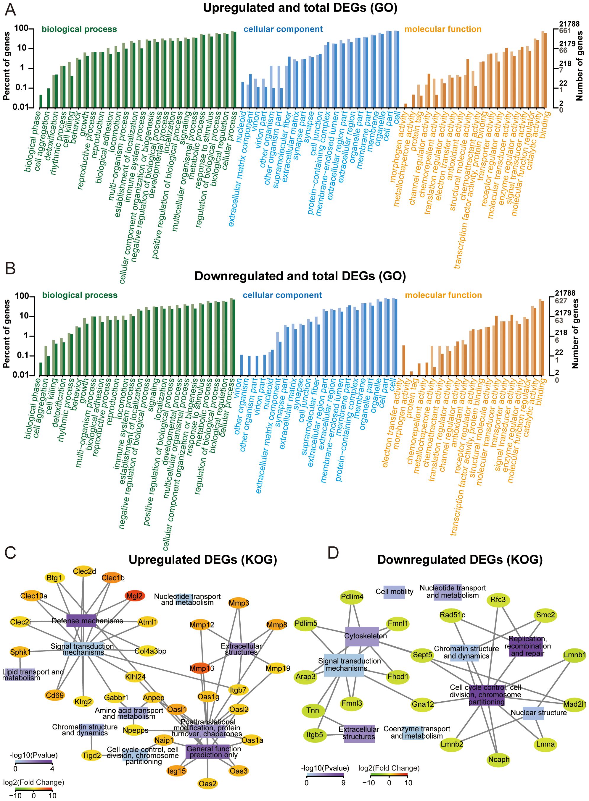 Figure 3. Gene ontology (GO) and KOG enrichment analysis. (A) GO annotation classification bar plot of upregulated genes. (B) GO annotation classification bar plot of downregulated genes. (C) Significantly enriched functional interaction network of upregulated genes. (D) Significantly enriched functional interaction network of downregulated genes.