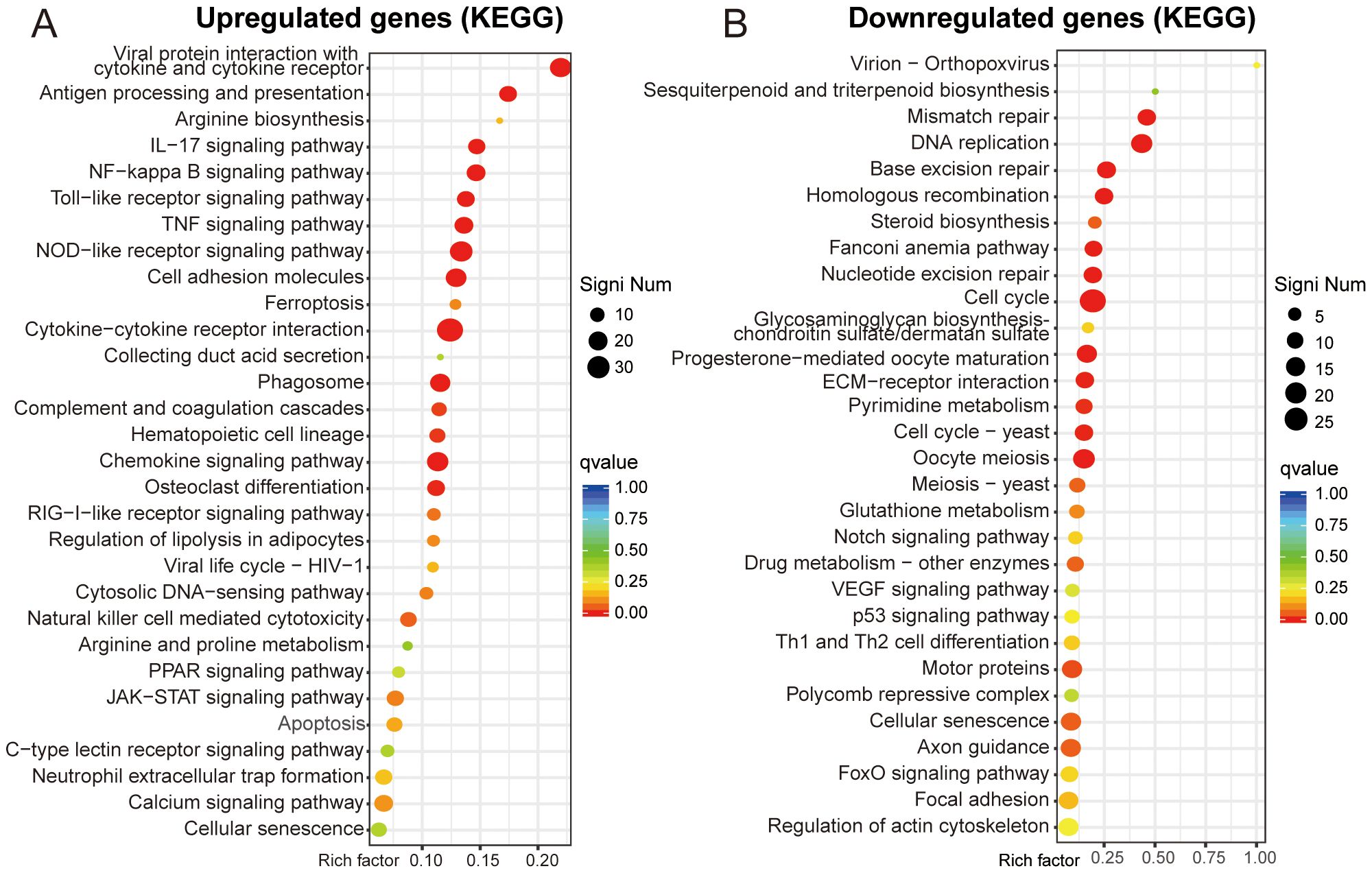 Figure 4. KEGG enrichment analysis. (A, B) Functional enrichment scatter plot of upregulated and downregulated genes.