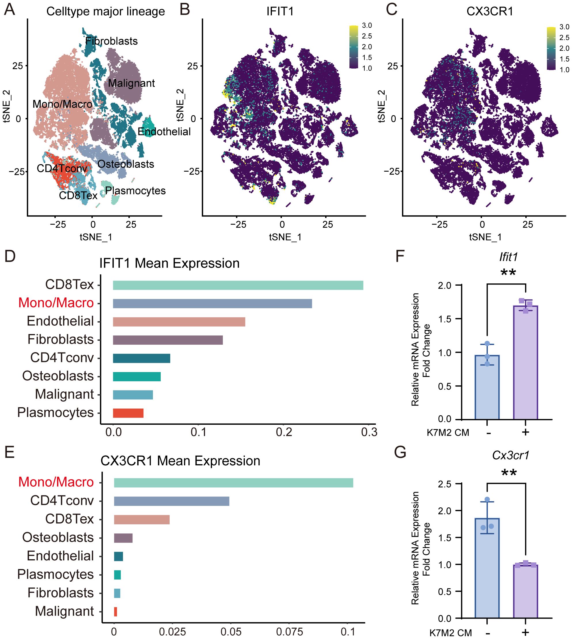 Figure 5. The expression of IFIT1 and CX3CR1 in OS. (A) The t-SNE plot of single-cell clustering. (B, C) The t-SNE plot of the expression distribution of IFIT and CX3CR1 in different cells. (D, E) The bar chart of the expression abundance of IFIT and CX3CR1 in different cells. (F, G) Relative expression levels of Ifit1 and Cx3cr1 in BMMs with or without K7M2 CM, normalized to β-actin.
